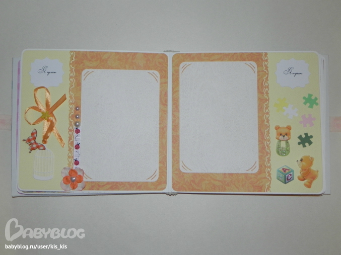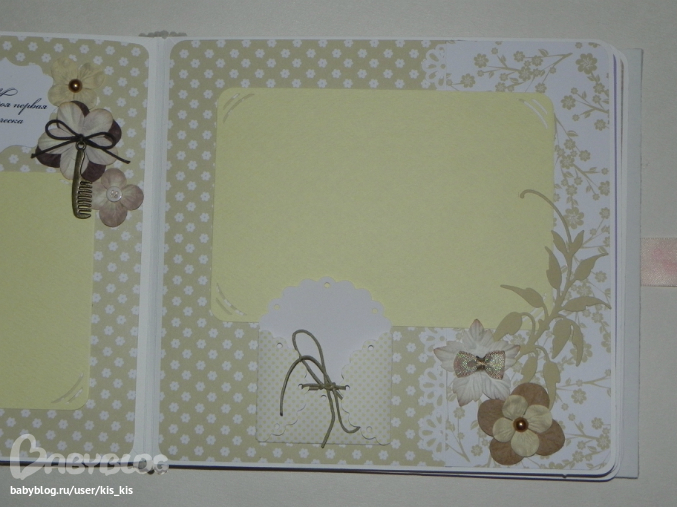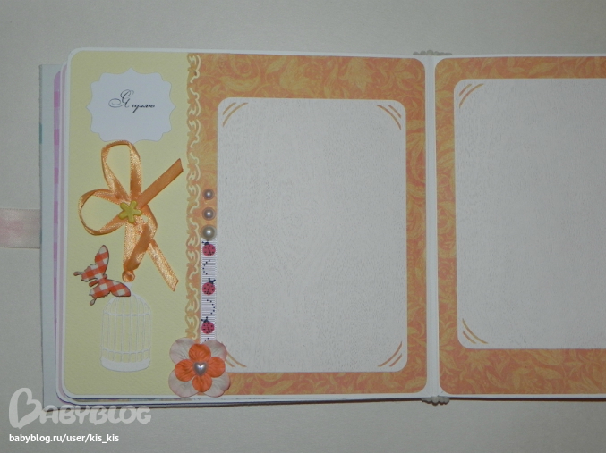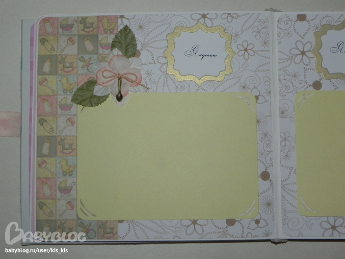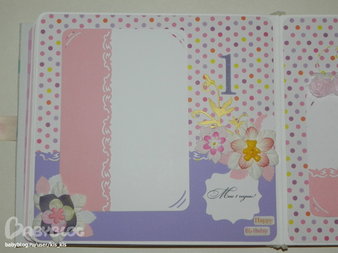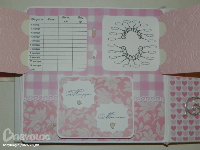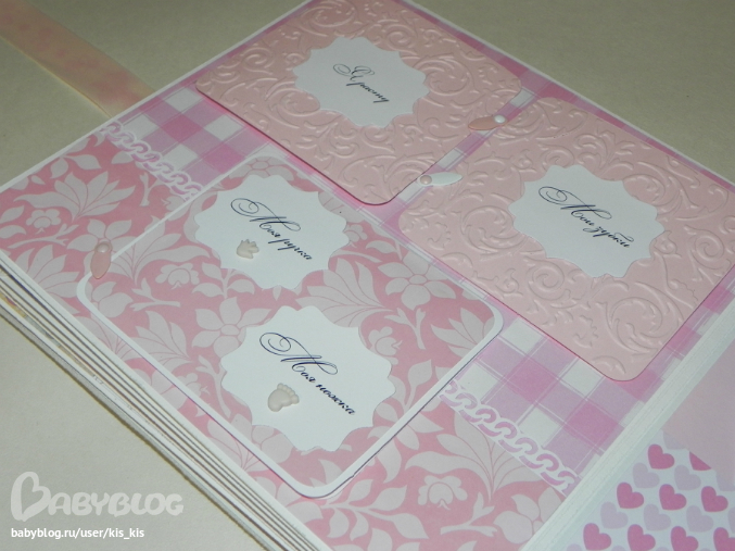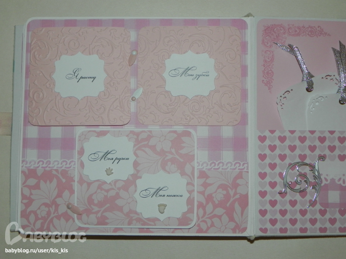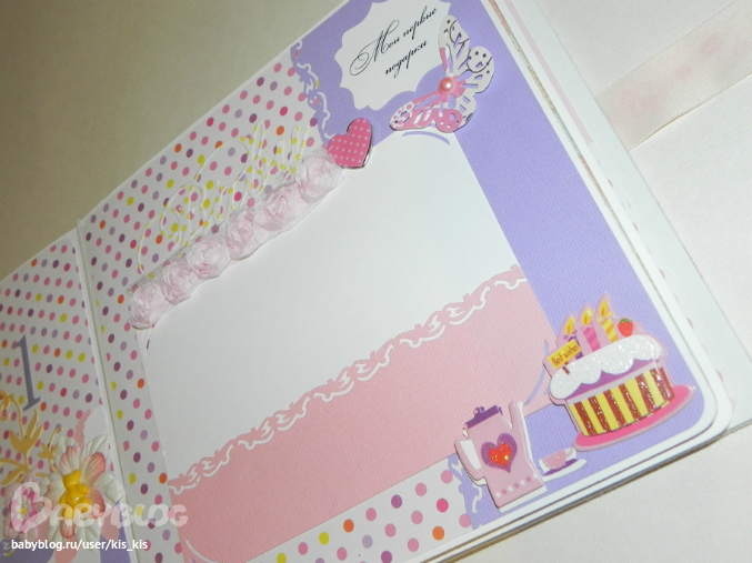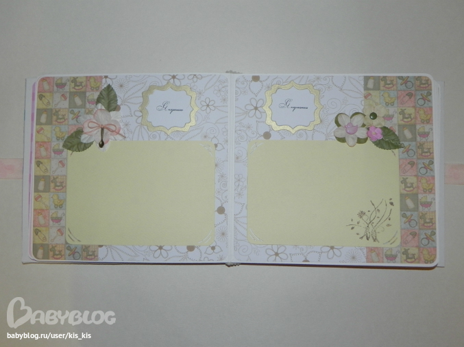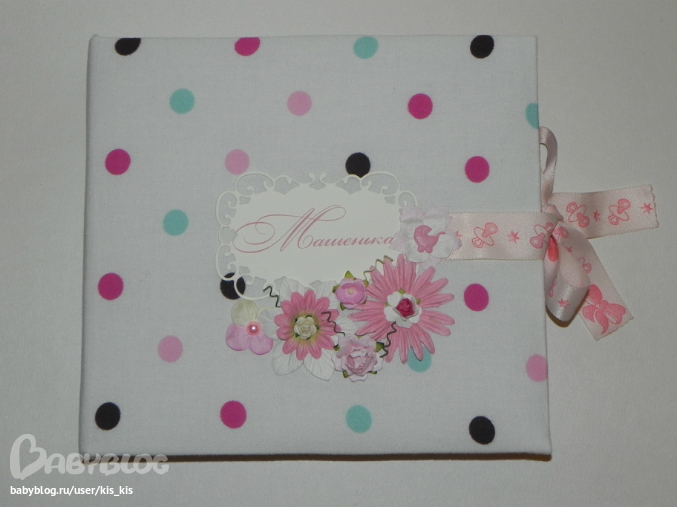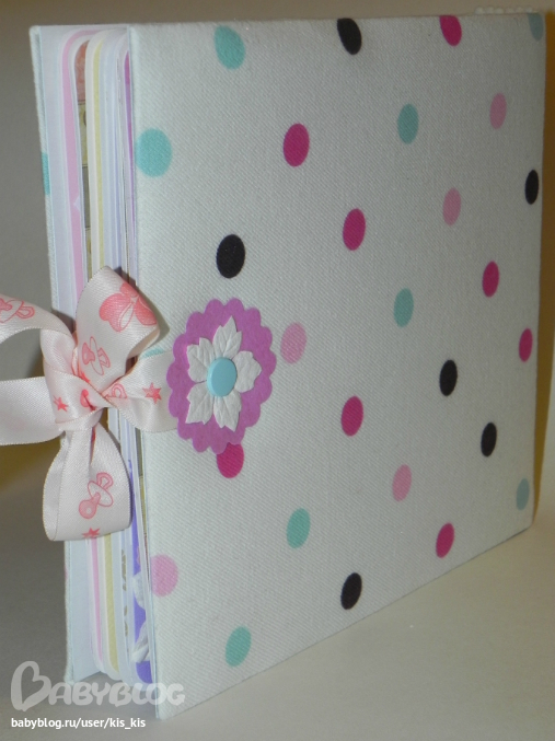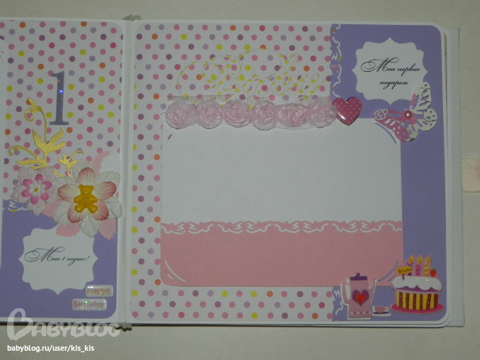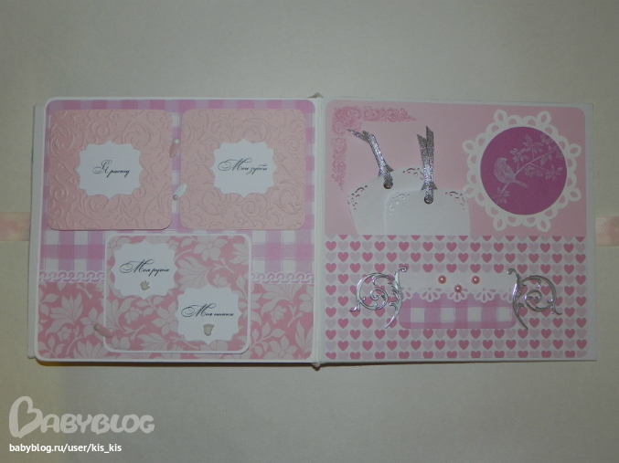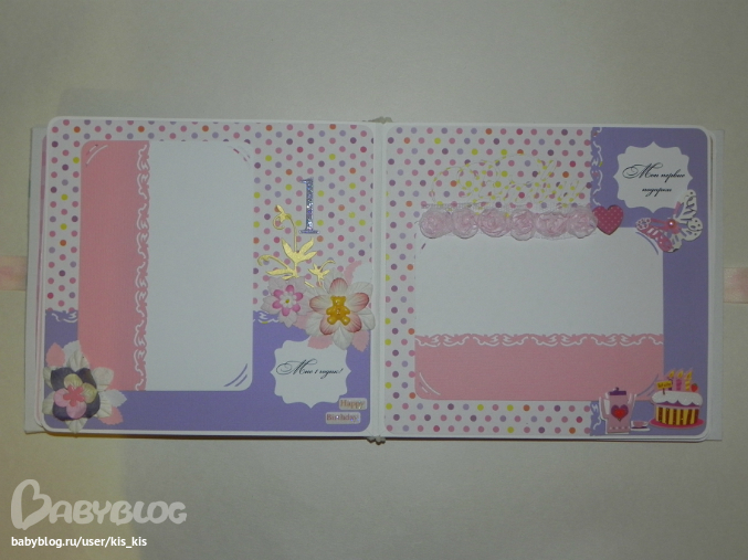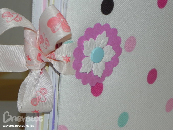 Альбом размером 20 см * 20 см, на 8 разворотов, 16 страниц, на 13 самых важных фотографий размером 10см*15см. Кармашки для УЗИ и дополнительных записочек на форзацах альбома. Есть конвертик для первого локона, а также последний разворот альбома посвящен тому, как малышка растет и взрослеет: вес, рост по месяца и датам, даты и очередность прорезывания зубок и, конечно же, есть местечко, куда вставятся отпечаточки крохотных ладошек и ножек. Расписывать где какое фото расположится опять-таки не стОит - все понятно по аксессуарам на страничке. Обложка обтянута мягенькой фланелько-трикотажем, очень теплая и приятная ткань, завязывается альбом на плотные ленточки с милым девчачьим принтом!