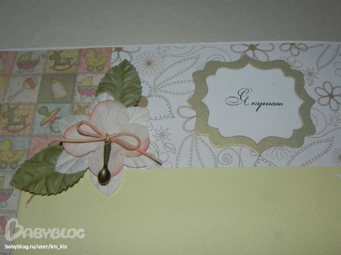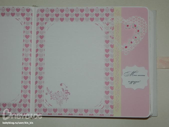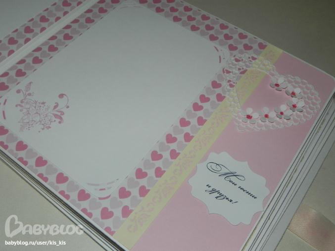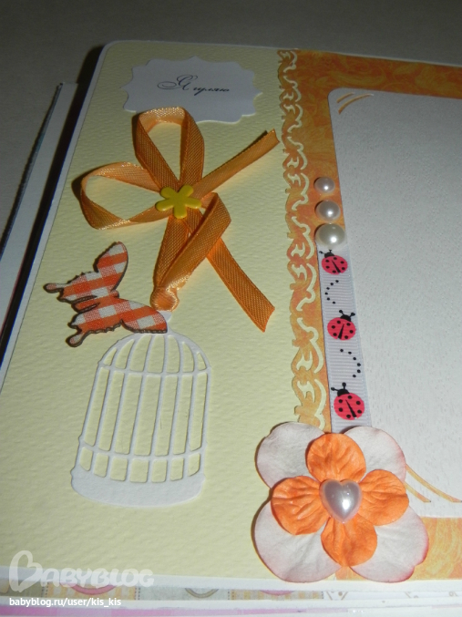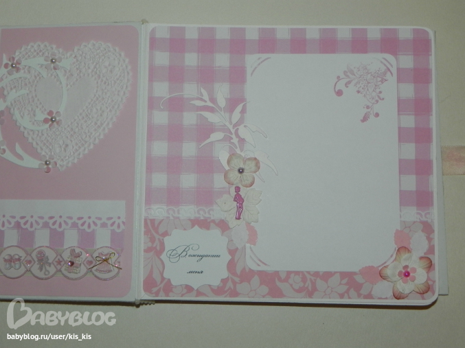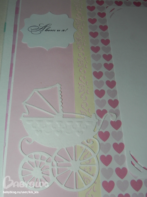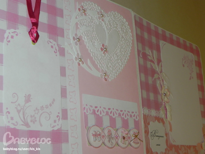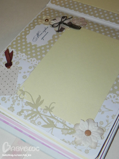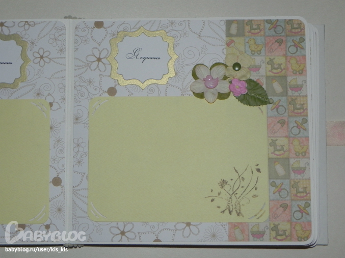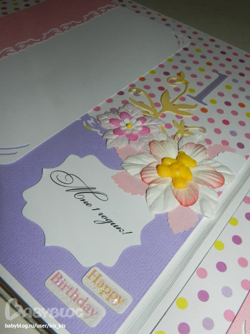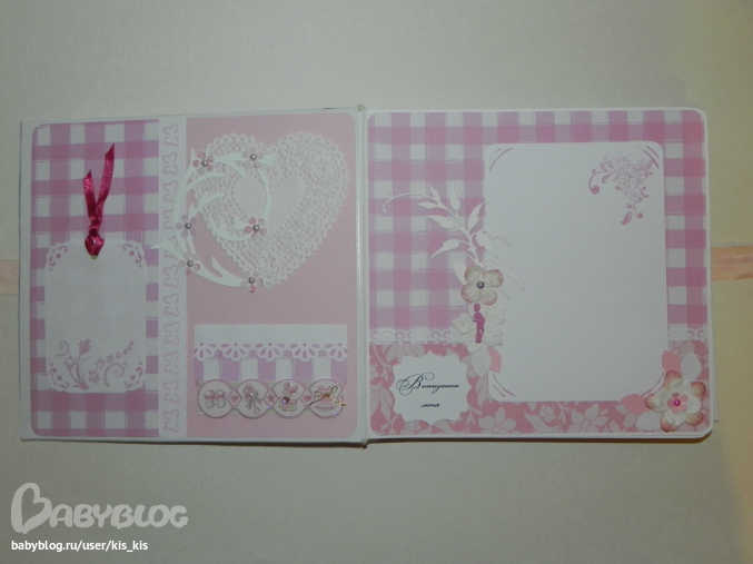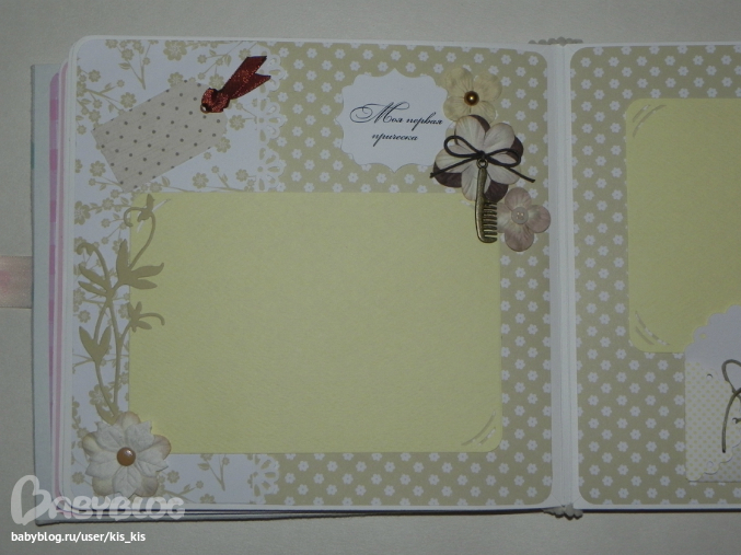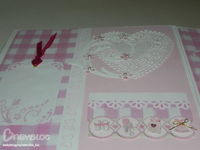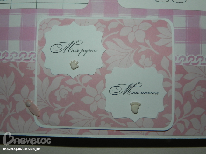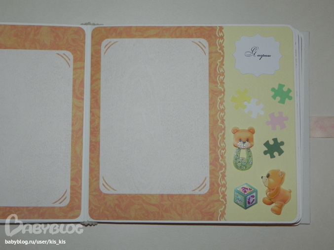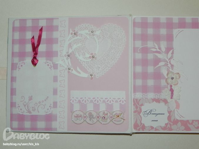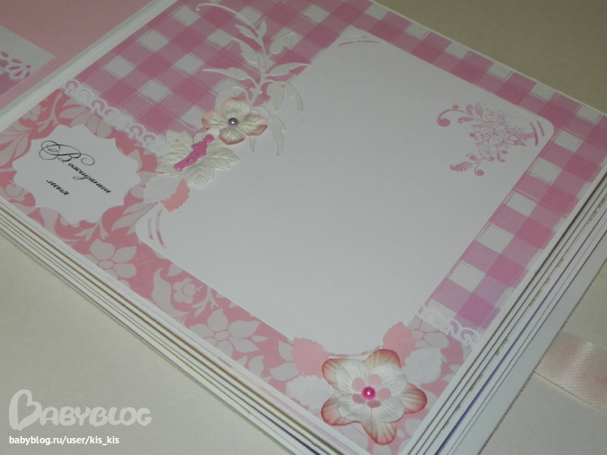 Альбом размером 20 см * 20 см, на 8 разворотов, 16 страниц, на 13 самых важных фотографий размером 10см*15см. Кармашки для УЗИ и дополнительных записочек на форзацах альбома. Есть конвертик для первого локона, а также последний разворот альбома посвящен тому, как малышка растет и взрослеет: вес, рост по месяца и датам, даты и очередность прорезывания зубок и, конечно же, есть местечко, куда вставятся отпечаточки крохотных ладошек и ножек. Расписывать где какое фото расположится опять-таки не стОит - все понятно по аксессуарам на страничке. Обложка обтянута мягенькой фланелько-трикотажем, очень теплая и приятная ткань, завязывается альбом на плотные ленточки с милым девчачьим принтом!