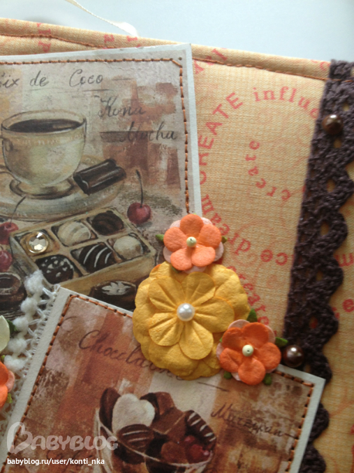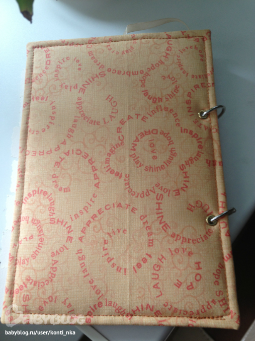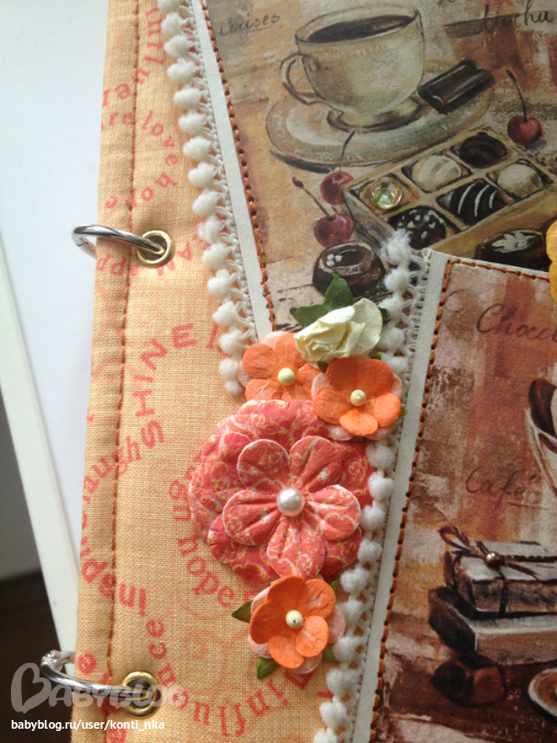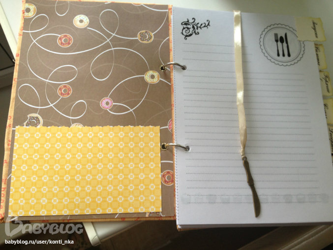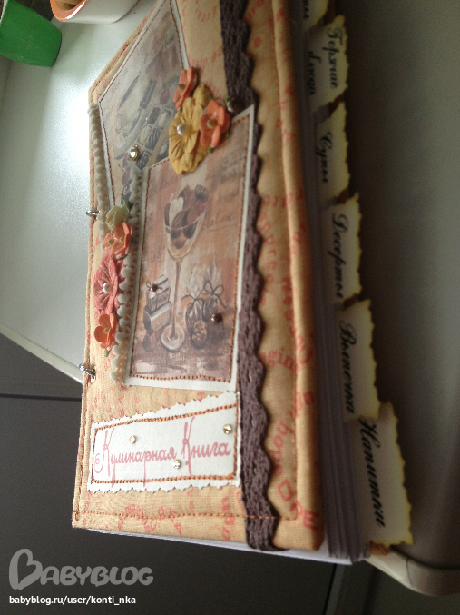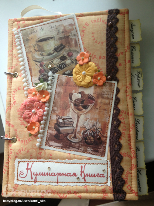 СкрапбукингСотворила вот такую кулинарную книгу в подарок. 120 листов с разделителями, обложка тканевая с машинной строчкой, на кольцах. Внутри пара карманов для всяких листиков с рецептами, есть закладка.