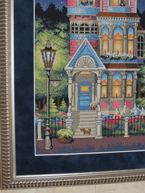 Мой домик в оформлении. Что касается заголовка, то тут отдельная история. Я всегда оформляю свои работы в багетной мастерской "Ностальгия", есть у нас такая во Владивостоке. Оформление у них всегда качественное, сроки разумные - не более недели и даже меньше выходило, цены умеренные, претензий к ним ни разу не возникало. Но есть одно НО - багета у них не то что бы много, скорее мало и не пополняется. И если оформлять работы постоянно, то рано или поздно выбирать станет не из чего. Когда я прихожу в багетку, я как правило, уже начала шить что-то новое и потому автоматически присматриваю "одежку" для будущей картины, прикидываю что бы можно было придумать из имеющегося. Так было и в прошлый раз, когда я поняла, что домик оформлять мне у них не во что. И вот я решила пойти в другую багетку. Но лучшее, как известно, враг хорошего. С самого начало все говорило в пользу того, что надо разворачиваться и уходить. Во-первых, не оказалось, темно-синего паспарту, не то что бархатного, а вообще никакого синего. Я зачем-то согласилась на коричневое (!) Да и фиг бы с ним, если бы все сделали качественно. При расчете выяснилось, что мастер в отпуске и ждать надо 2 недели. Ладно, жду, что делать, раз уже все измерили и посчитали. Получив готовую работу, я, не привыкшая работу пристально рассматривать на месте, обнаружила косяки только дома, когда повесила домик на стену. Пара узелков была распущена, домик, как Пизанская башня, клонился вбок. Наверное, несложно представить мое состояние. Три месяца кропотливой работы и такое небрежное отношение со стороны "мастера". Сначала хотела идти ругаться, но из меня такой скандалист.. Хотела сама все переделать, даже разобрала эту конструкцию. Но натянуть не смогла. В общем, сдала мой многострадальный домишко в "родную" багетку, где выбрала оформление за 2 минуты и паспарту, кстати, было в наличии. Сегодня получила готовую работу и представляю на ваш суд. Извиняюсь, если утомила своим длинным рассказом, просто накипело)))