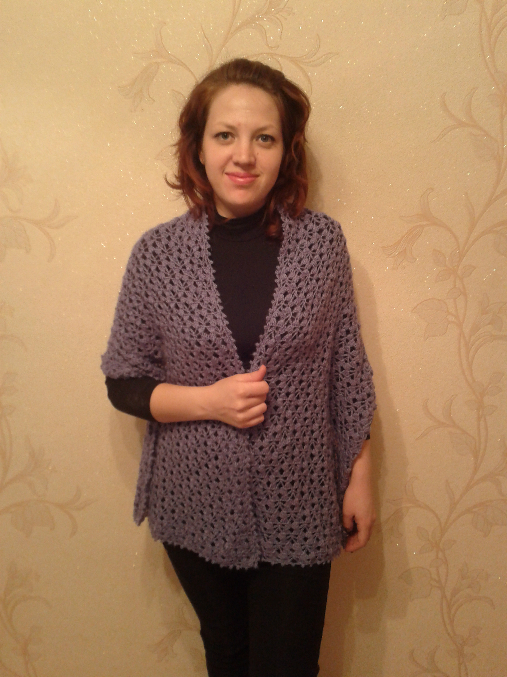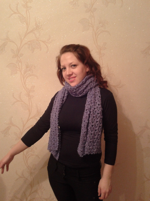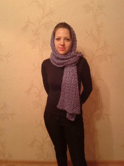 Сиреневый палантин. Связан из ниток Лама, производство Ярн, Россия. Размер 1,5 х 43 см. Первый раз вязала из этих ниток, очень понравились. Мягкие, не колятся. После стирки не растянулись, чуток отпарила. Больше всего понравился вариант на голове, хочу купить себе оранжевые-коричнеые нитки и связать себе, еще снег лежит, успею поносить))