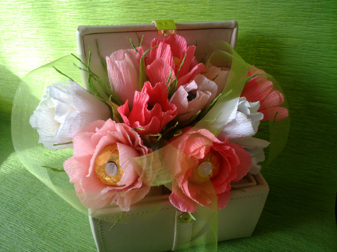 Спасибо, шкатулка это и был подарок, вы правы. Она для драгоценностей, есть верхний съемный отсек- для колец . Не хотелось буднично дарить, в итоге придумалось такое. Причем технически долго изобретала- букет съемный поэтому нужно было так исхитрится чтобы со всех сторон было красиво, от фунтиков пришлось отказаться