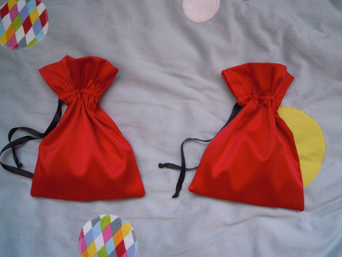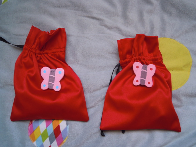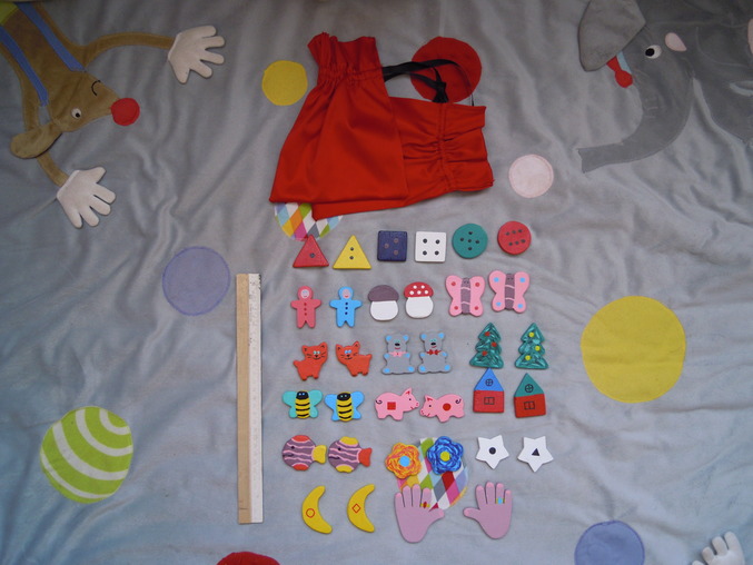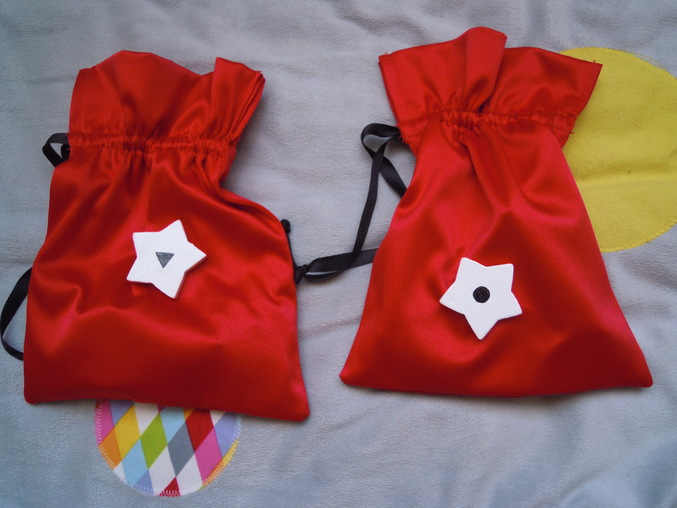 Развивающие игрушкиШьется два одинаковых мешочка, у меня красные. В каждый мешочек помещаются парные предметы, у меня таких пар 17.