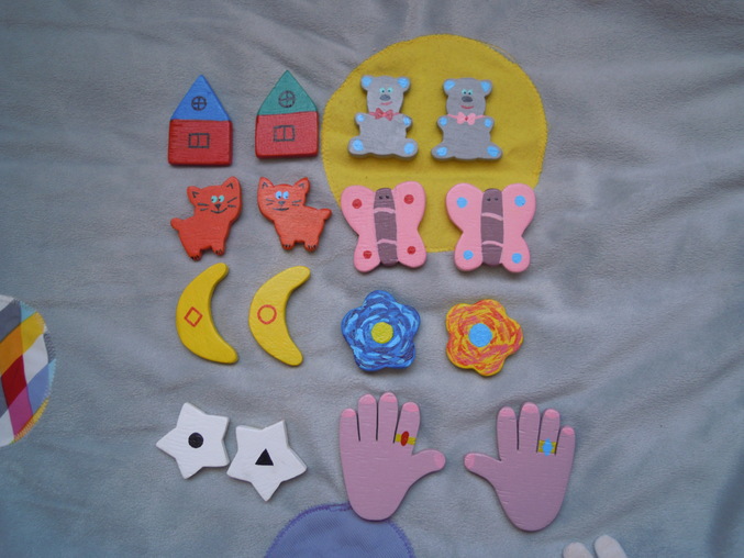 У домиков разные крыши, у мишек разные бантики, у котят разные глаза,у бабочек разные пятнышки, на месяцах разные фигуры, цветочки разного цвета, на звездочках разные фигуры, на руках на разных пальцах разные кольца. Кроме того можно учить правую и левую руку,на обратной стороне пальцы пронумерованы от одного до пяти.