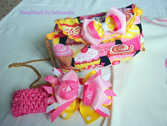 Настя спасибо. Ты большая умелица! Думаю такую сумочку за пару часов сможешь сшить)))) Такой набор стоит 1400р. с сумочкой, брошкой, 2 парами бантов и одним бантом на повязке
