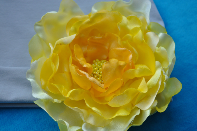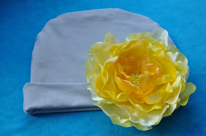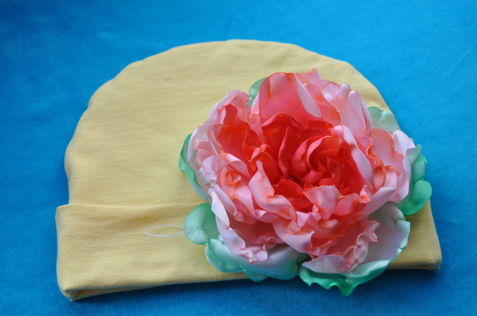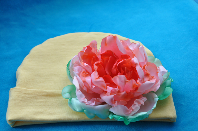 Шапочка цвет "светло желтый" + цветок. Цена 750 руб