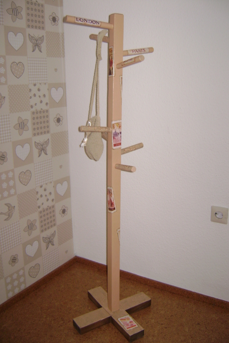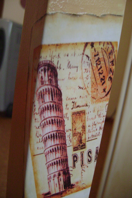 од работы: ошкурила, покрыла тремя слоями беловой акриловой краски, с просушкой каждого. Подготовила распечатки - покрыла лаком, расслоила (задумка - марки с разных городов, таблички с названиями Лондона, Парижа и Рима). Обожгла картинки, расслоила, приклеила распечатки.Намешала нужные краски, на некоторых крючках-палочках делала одношаговый кракелюр (очень хотела двушаговый, но мне просто не получилось бы смывать лишнее), покрыла сначала крючки и основание темной краской, выполнила кракелюр. Покрыла всю вешалку светлой бежевой акриловой краской тремя слоями, с просушкой каждого. Покрыла двумя слоями лака, пошкурила, покрыла тремя слоями лака.