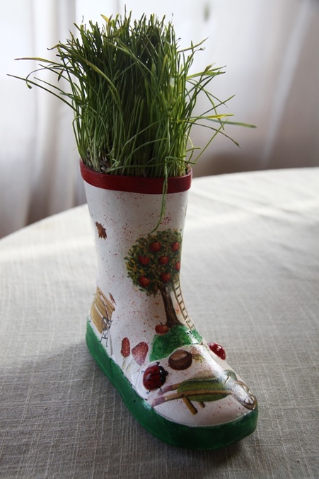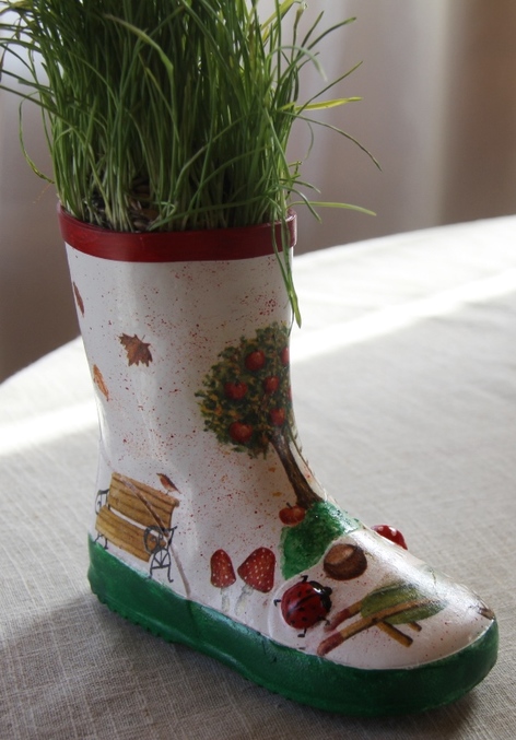 Загрунтовала сапог, наклеила мотив, покрыла лаком. Дорисовала рисунок, на выпуклостях нарисовала божью коровку и мухомор (вид сверху))), основу сапога зеленым и верх сапога красным, пошкурила покрыла лаком нанесла брызги, покрыла лаком с просушкой несколько раз. Вставила траву. которую муж купил коту)) можно было и горшочек с цветком, не было такого маленького. Сапог получился осенне летним.