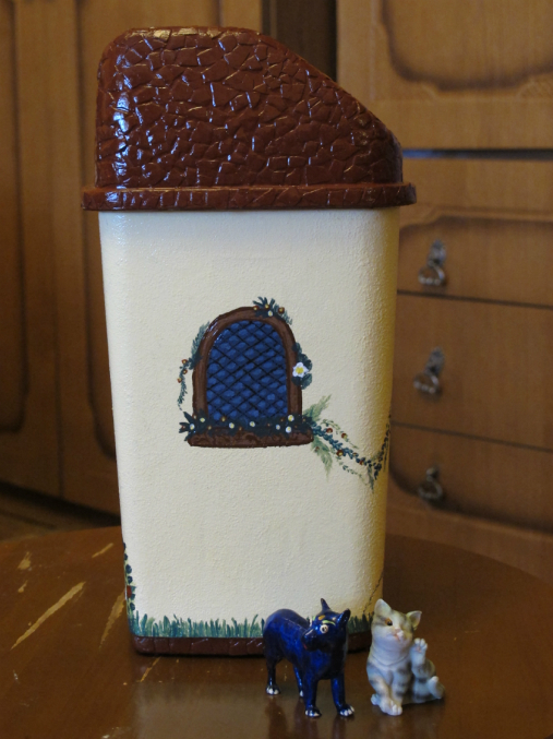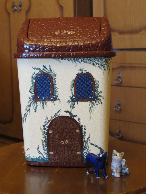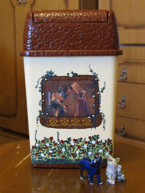 После поисков необычных предметов в доме, мой глаз упал на мусорное ведерко под столом, после чего было принято решение задекупажить этот предмет, в виде замка.