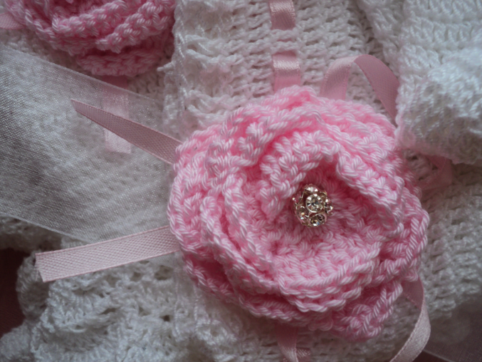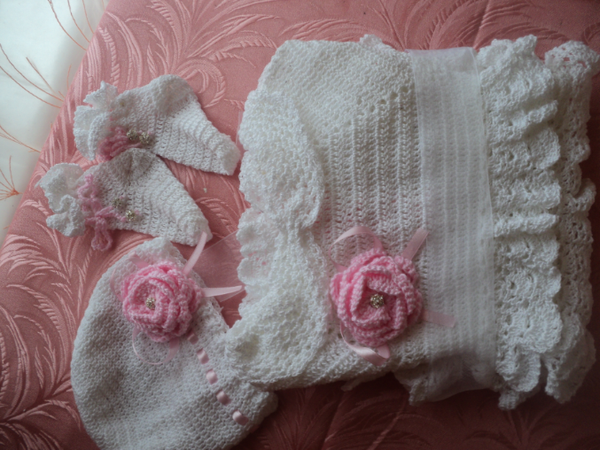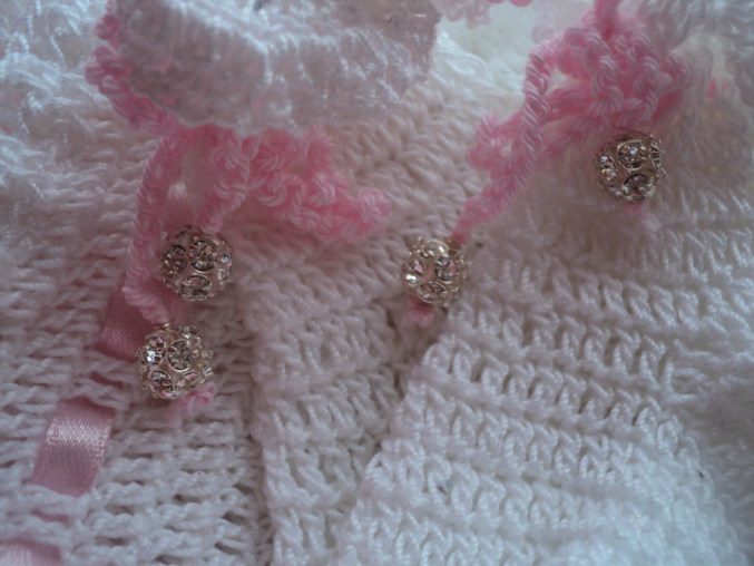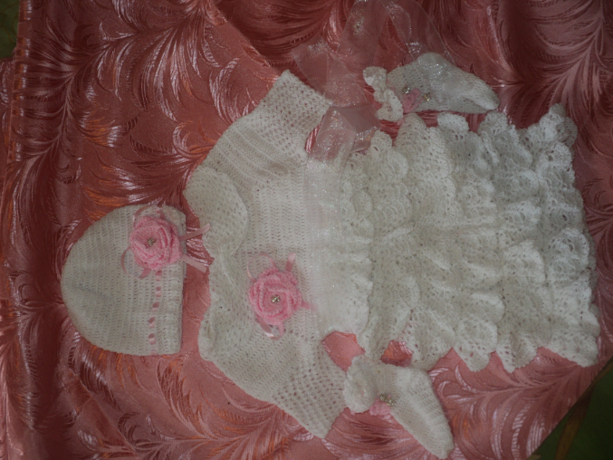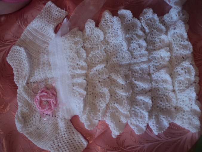 наконец то я это довязала))) месяц на это ушло) результатом довольна)) есть погрешности но ничего, это первая большая работа) вязала сестре на крестины))(фото под катом) только вот не придумала что делать с пуговичкой сзади и как ленту крупную прилепить или может совсем ее поменять на другую))
