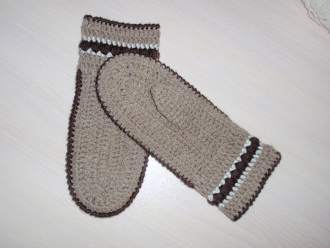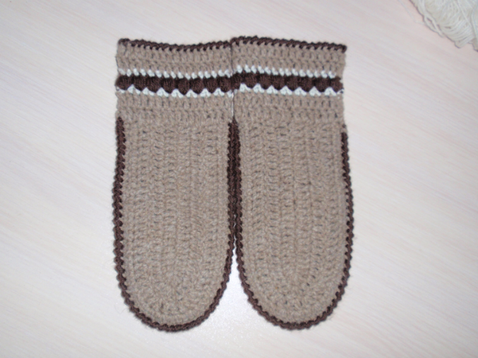 Варежки для мамы, хотела их украсить цветочками, но в таком виде понесла на примерку, да так они там и остались, отказалась мама от цветов, ручки мерзли. Сын тоже захотел такие же из такой же пряжи, но ему по другому связала. вообще это первые мои варежки, хоть их осилила, а то носки у меня совсем не идут, пока все, есть еще вязалки да не довязаны пока.