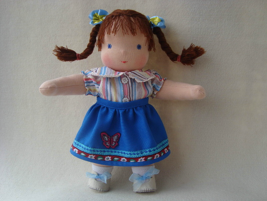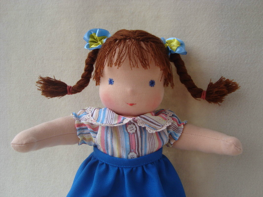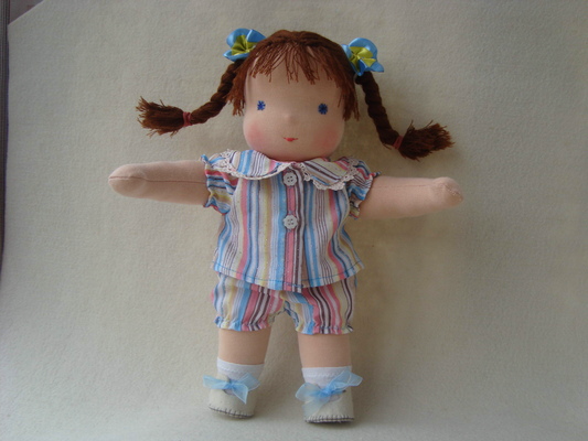 Не хватило пряжи на волосы, пришлось сделать фиксированную прическу - хвостики не распускаются,пришиты у основания. Косички получились тоненькие, мы такие называли мышиными хвостиками. Но куколка, как мне кажется, от этого не пострадала, трогательная такая :))) Кофточка и панталончики могут быть самостоятельным нарядом. Рост 33 см. (Ищет дом)