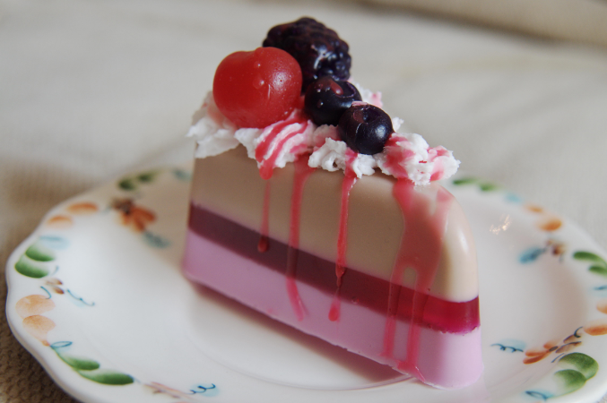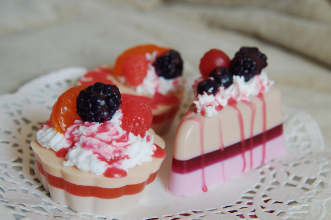 эклер не впечатлил, может "тесто" потемнее сделать, чтоб было видно отличие от "крема". Треугольное тоже не приглянулось... у меня формочка такая же, но смотрится очень никиак( Купила, но форму не полюбила(( (это не критика, просто вслух((( А вот пироженка с кремом - хоть счасс чаем покушать!!! Свет,а крем - это кремообразная? Из шприца? А сложно с ней работать? У меня стоит коробочка кремообразной, но даже не притрагивалась еще к ней(( п.с.: мыло очень аппетитное)))