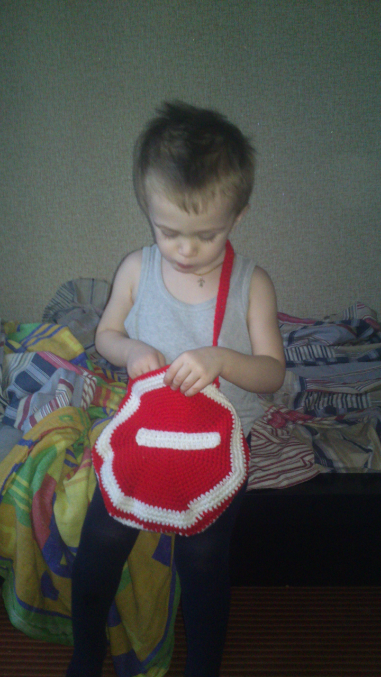 любит всякие сумочки и знаки дорожного движения, знаем все.... вот последнее время стал брать мою сумку и туда знаки складывать и ходить. Решила сделать ему свою, личную