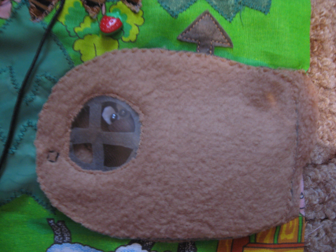 на дереве за маленькой дверкой живет совенок, дверка на крючок закрывается...