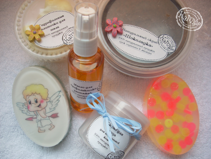 хе=хе и ЭТО ВСЁ мААААААААААЁЁЁЁЁ !!! Когда открываешь такие вот "вкусные" посылки-первым делом-аромат из них исходящий.....вдыхаешь пару минут, а потом начинаешь все это доставать,рассматривать, нюхать,щупать,читать прилагающиеся инструкции к каждому наименованию..в ОБЩЕМ, суперское ВСЁ - и мыло, и плиточки, и скрабы, и маслице.Скрабом для лица уже пользуюсь и маслом от растяжек на животе(это вообще мне ща актуально),мыло,как всегда,пока смотрю на него....жалко ж такую красоту юзать... и на плиточки, скраб ШОКОЛАДНЫЙ-это вообще мой фаворит, в любых других последующих заказах Кате обязательно его всегда буду заказывать,так как я наполовину беру его,ДА, понятное дело и для тела, а еще аромат вдыхаю..это что-то(хотя в моем положении ща че-то на кофейно-шоколадные ароматы не очень..),но не на скраб этот,почему-то...))) В общем, натуральная косметика ни в какое сравнение с магазинной продукцией,хоть и за бешеные бабки, и рядом не стоялО) . Начала вот пользоваться такой косметикой,ею и буду продолжать пользоваться и дарить самым близким и родным мыльца и скрабики(они в самом ходу всегда) . Так что Катюшку рекомендую как профессионала своего дела+ и цены у нее,как и у меня,чисто за материалы и ингридиенты-оч.приемлемые, не ценим мы свой труд(эээх) ,но зато КАК ПРИЯТНО ДЕЛАТЬ подарки друг другу))).Извиняюсь 10000000 раз,Кать, я если и захожу сюда, то тока личные сообщения почитать, а в ленту друзей редко захожу...