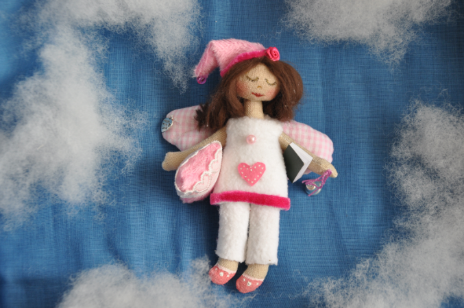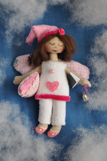 Спящая крошка с подушкой, колокольчиком и книжкой. Рост около 12-14 см. Для счастливого засыпания малышке и для видения красивых снов.