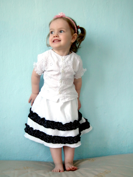 Шитье одежды, выкройки, ремонт одежды, шторы, швейные машины (уже приобретенные)Давно уже сижу в кустах, пора тоже что-нибудь показать. Дошилась вот такая юбочка для моей дорогой дочурки. Ткань - белый ситец советских времен, рюши - остатки от наших с дочек юбок. Рубашечка кстати тоже моего исполнения - перешила из бабушкиной летней блузки, которую она немного замарала в ржавчине.