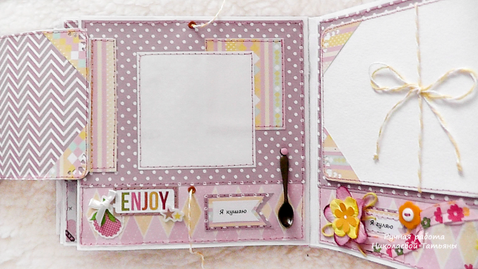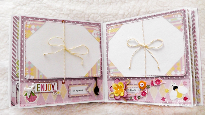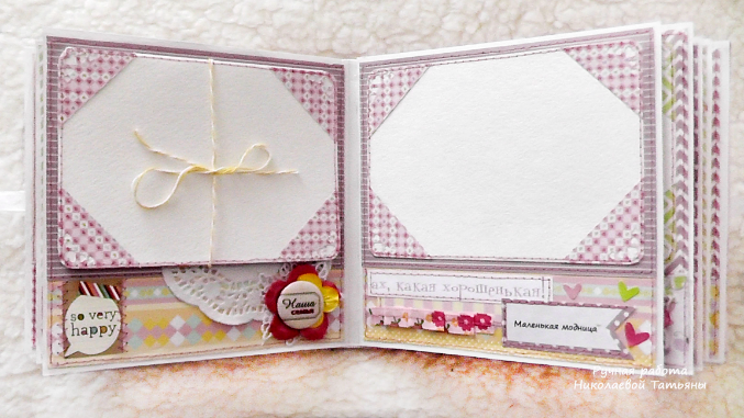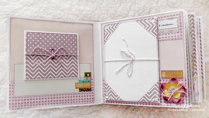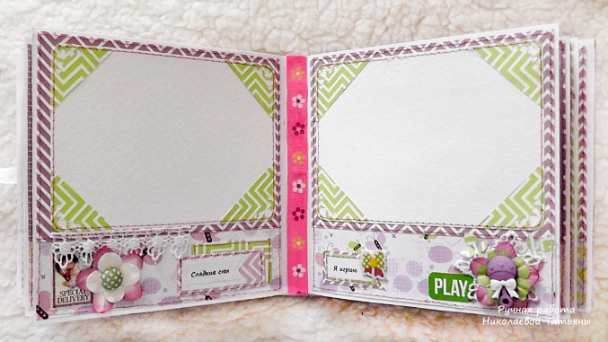 Вторая страничка посвящена ожиданию малышки, раскладушка вмещает 2 фото, карман для теста и место для снимка УЗИ, фотографировать не стала, ооочень торопилась, но они такие же как в предыдущем альбоме