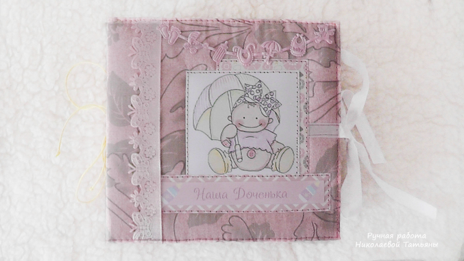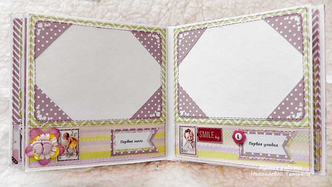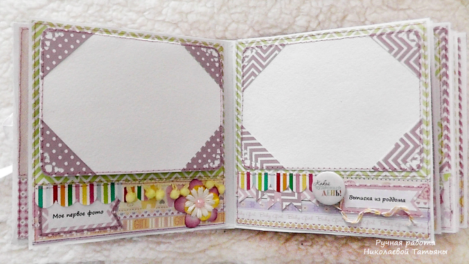 На первой странчке кармашек, туда я думаю спрячут бирочку, ну или что-нибудь еще, я ,например, в такой кармашек уместила первые дочкины носочки, которые ей одели в роддоме, также есть место куда можно что-нибудь записать