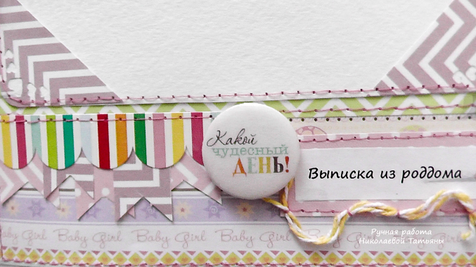 И последний разворот - мой день рождения (3 фото) и карман с тегами на которых записаны первые успехи малышки, а также отдельный карман для локона малышки, в кармашек также можно вставить пару фотографий...