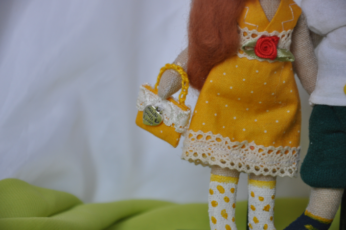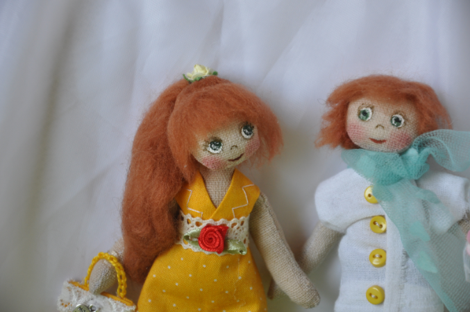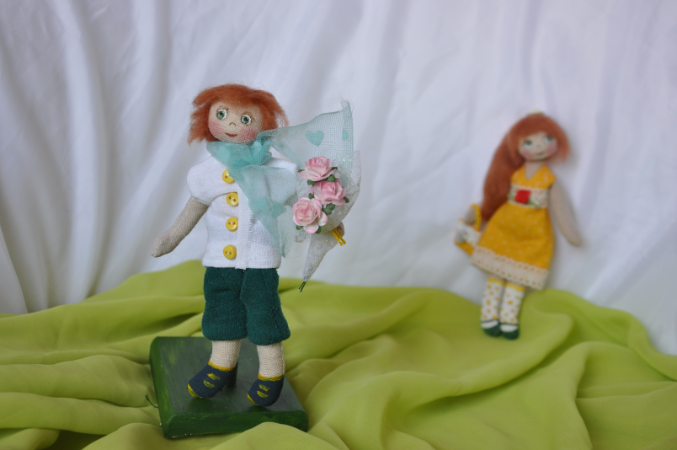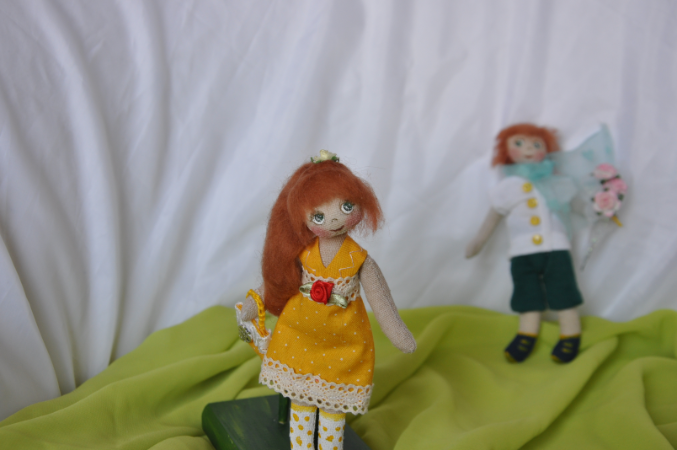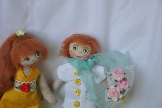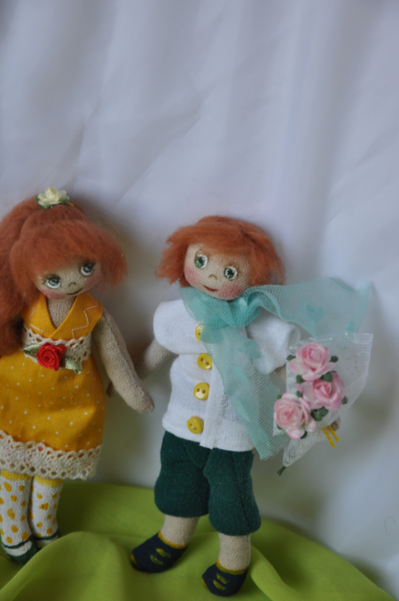 вообще изначально у меня было два тельца и не было образа. думала, может сошью сплюшечек или праздничных ангелочков, но перед глазами оказался ПОСЛЕДНИЙ (СОС! но ничего, завтра должны прийти ещё ткани Супер мега новые и крутые!) кусочек от тканюшки, подаренной мне Викой. и из него решила сшить платьице. оч понравилось. создала девочку-Лето, но поняла. что это про любовь) и ей срочно нужен компаньон, так родился Он. теперь их двое и композиция законченная и полная. оба похожие друг на друга (истинные половинки), румяные, круглоглазые, рыжеволосые.