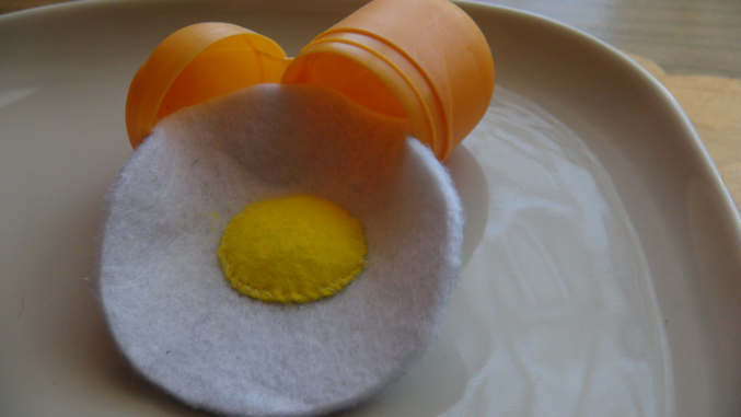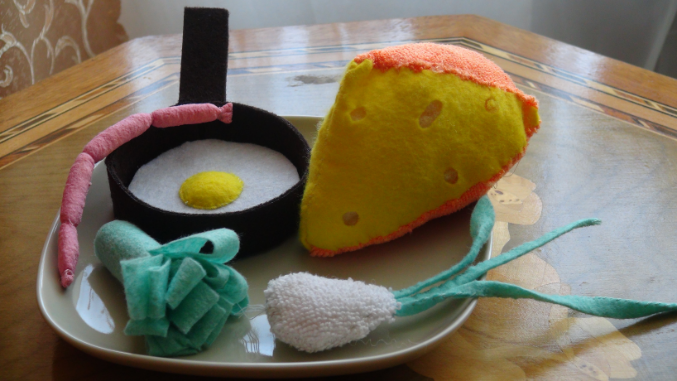 на 4 фото - сосиски, брокколи, зеленый лук, сыр и яичница в сковородке (сковородка сшита из фельта)