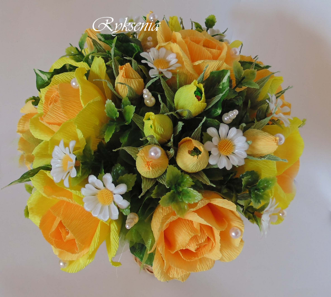 Корзиночка получилась очень солнечной , такое тепло исходит от букета! работа на 5 !!!я тож склоняюськ тому,чтобантик здесь не нужен!Оксана, умница!!