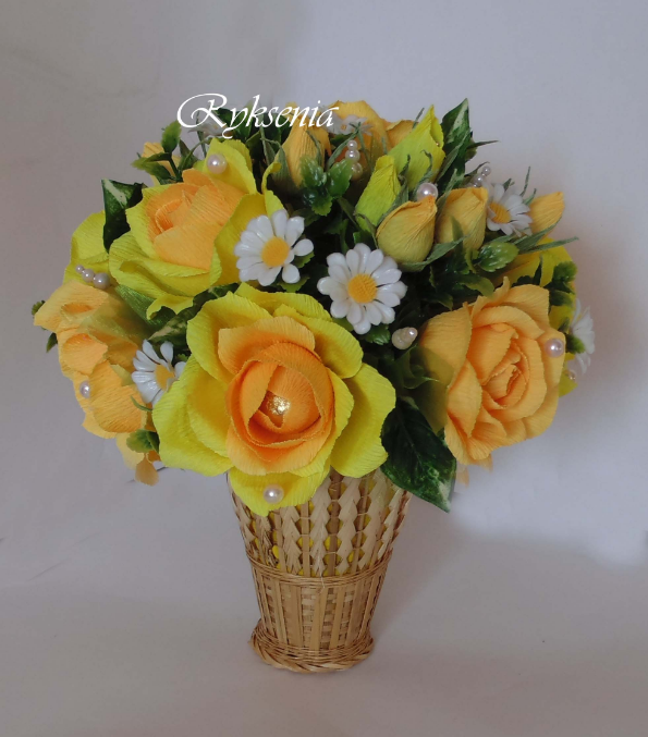 очень красиво,солнечно!А я бы на вазочку или что это,корзинка прикрепила ленточку белую пошире и на нее желтая поуже.ну как то так))))