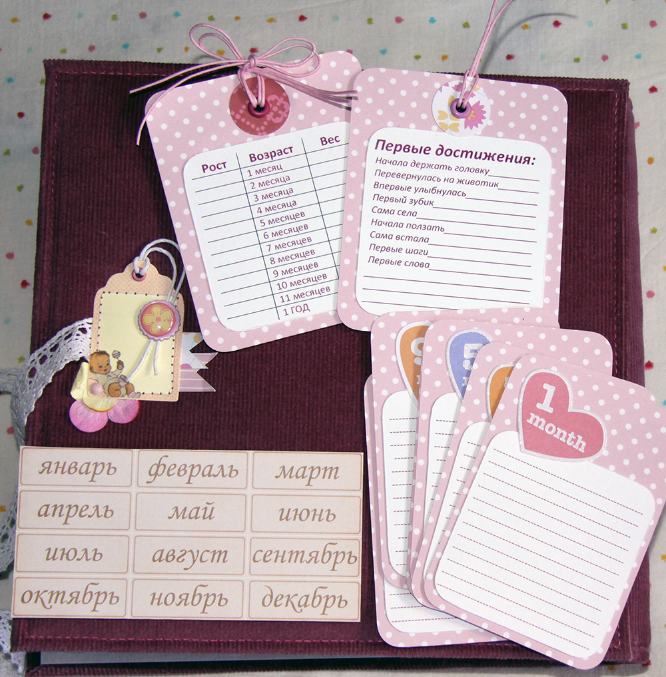 Здась карман с тортом на магните, вмещает карточки для записи достижений или памятных моментов по месяцам. На последней странице карман для диска.