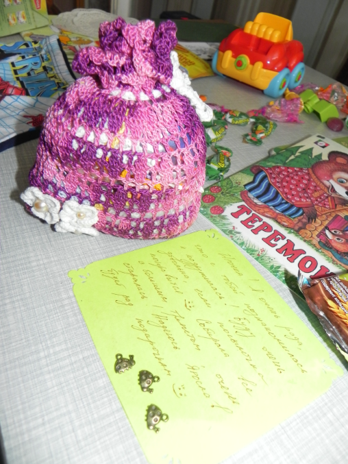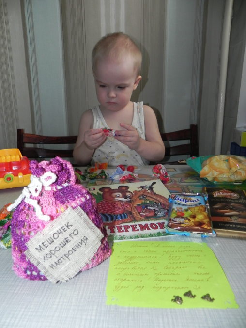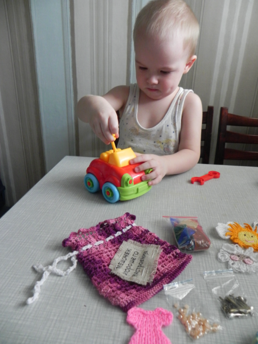 Пока маленький мущщина занят авто, мама с замиранием сердца открывает "Мешочек хорошего настроения"... А там... Дальше СМОТРИТЕ!!! Варежки настоящие!!! Еле-еле на мизинчик лезут!!! Представляете КАК это надо так связать??? У меня просто нет слов!!! Мастерица, Анют!