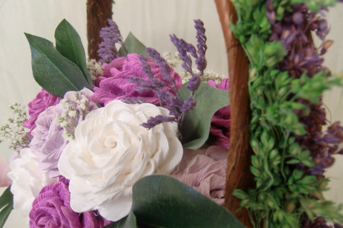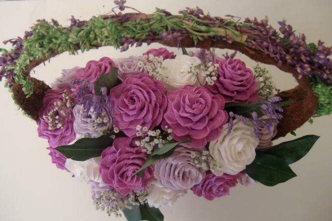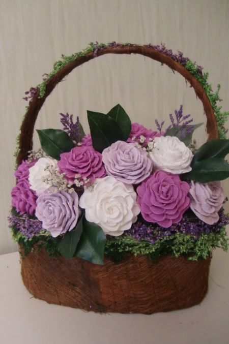 Девочки, добрый день! Вдохновленная вашими комплиментами, и подстегиваемая своим желанием творить, представляю вам свою новую работу. Корзина с розами. Розы выполнены из флористической гофрированной бумаги. Дополнительно использовала живые цветы, которые (как мне рассказала продавец в цветочном магазине) в будущем станут красивыми сухоцветами.