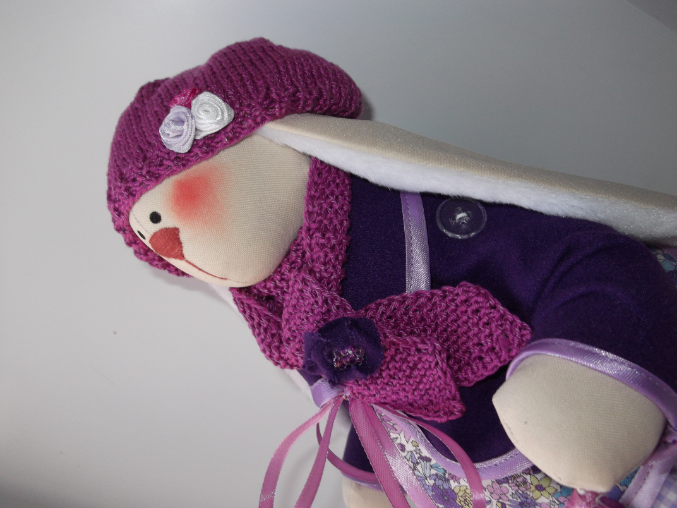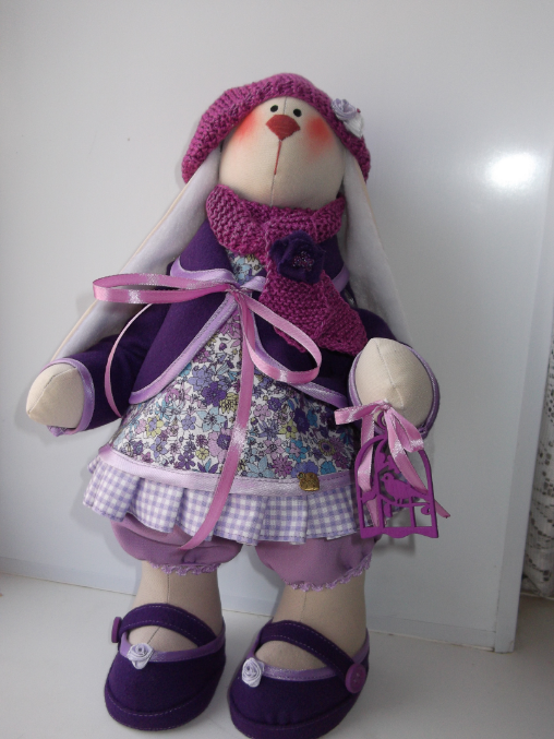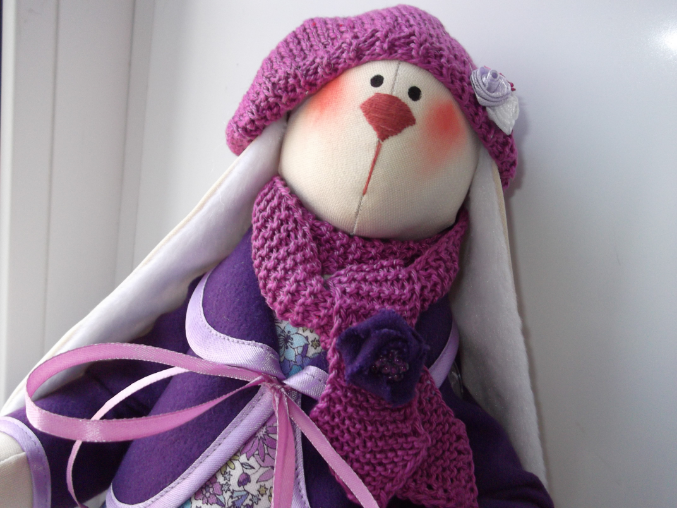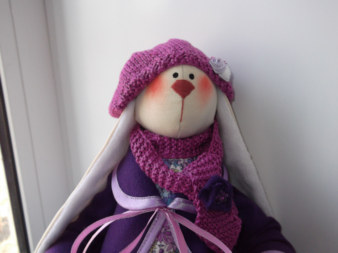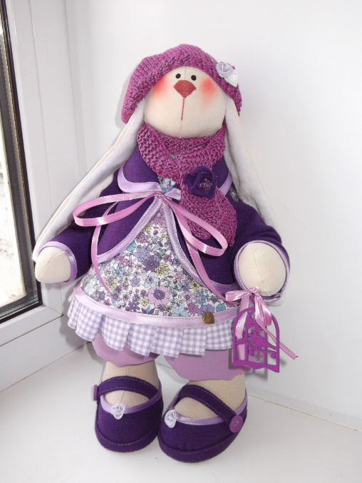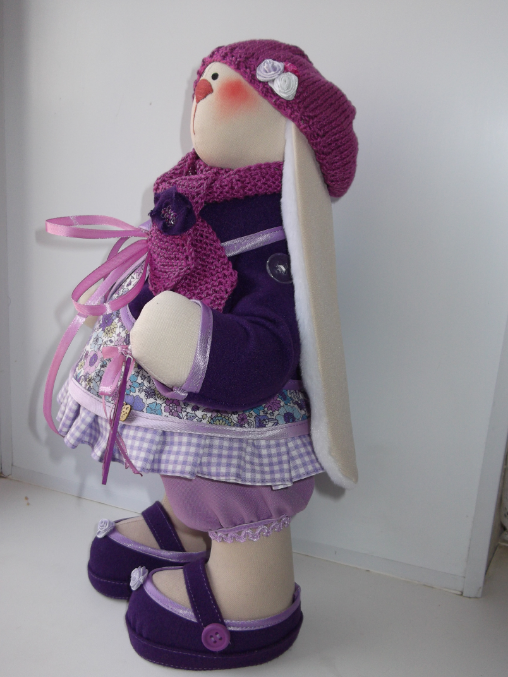 зайка , совсем весенняя, запахло сиренью и весной .Самостоятельно стоит и сидит, ноги и лапки подвижны ( пуговично -нитяное крепление).Берет и шарф связаны из ириса , курточка и туфли -очень тонкий драп, платье американский хлопок . Украсит интерьер детской и послужит замечательным и совсем индивидуальным подарком, ведь она совсем , совсем в единственном экземпляре. Продается .