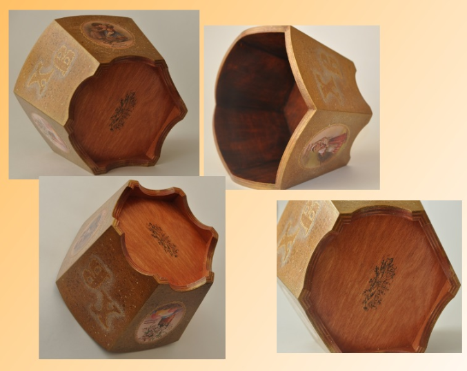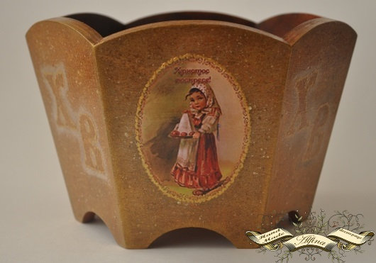 ДекупажИсполнила на заказ такую сухарницу. Впервые поробовала восковое патинирование, спасибо Наталье Шихаревой за науку! В работе использованы приемы многослойного морения, ручная подрисовка контурами и трафаретная роспись из изготовленных вручную трафаретов.