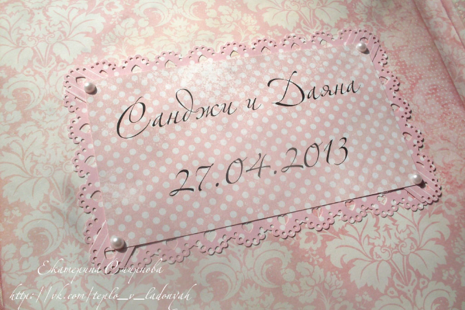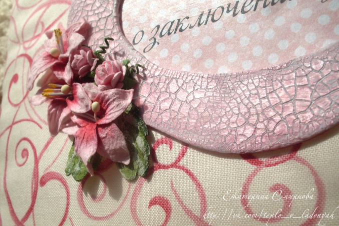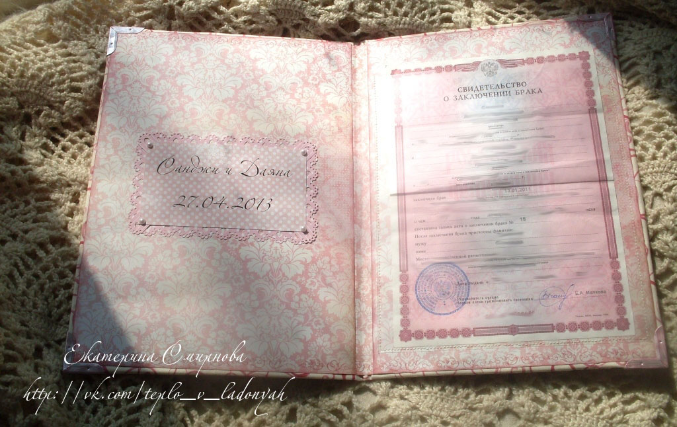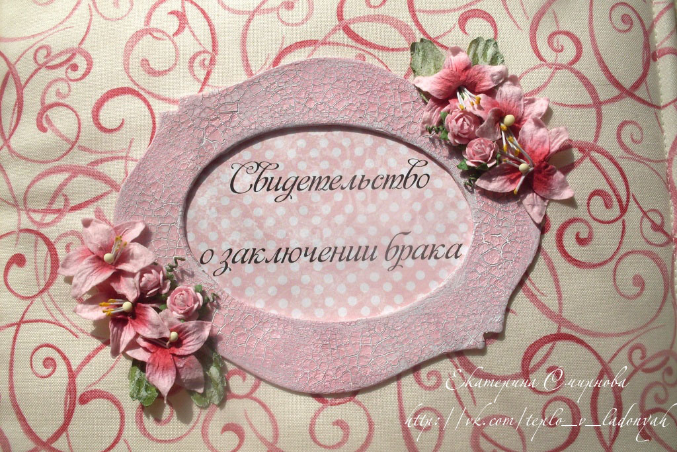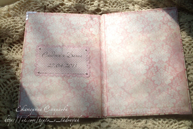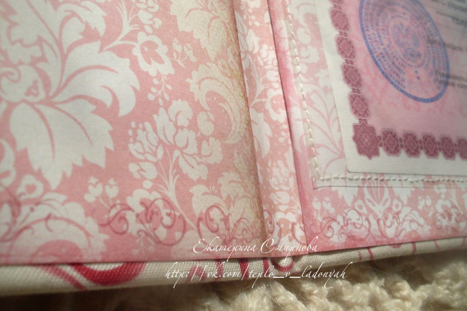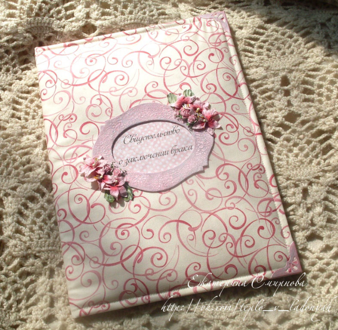 Обложка мягкая за счет слоя синтепона, обтянута хлопком. Внутри отделана скрапбумагой. Кармашек для свидетельства из пластика. Украшалки - металлическая фурнитура, чипборб-рамочка, цветочки)