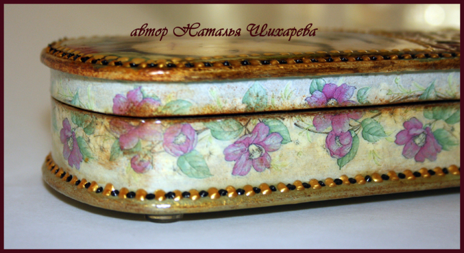Просили чтобы было было прям старенько, кракелюр обязательно, пришлось спец лаком тонировать, чтобы пожелтевшее было все) В реальности оч похоже на старину) Ножки силиконовые поставила) за неимением у такого футряра своих)