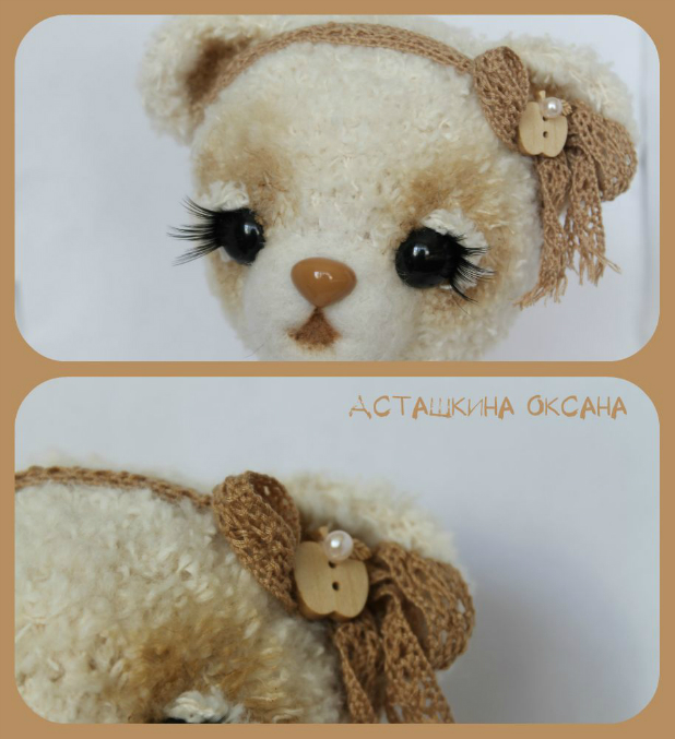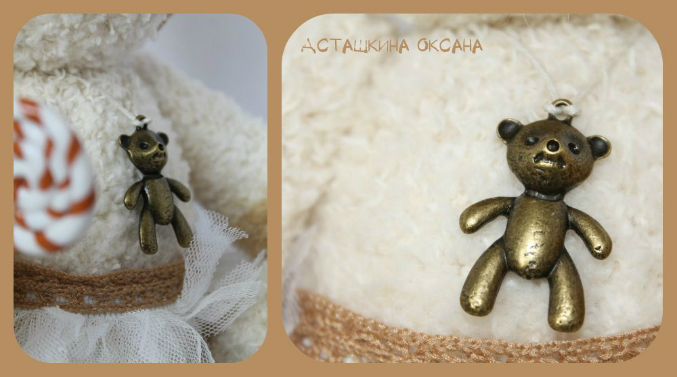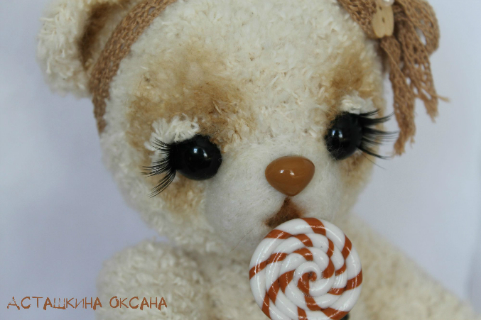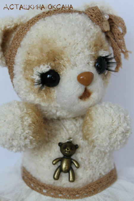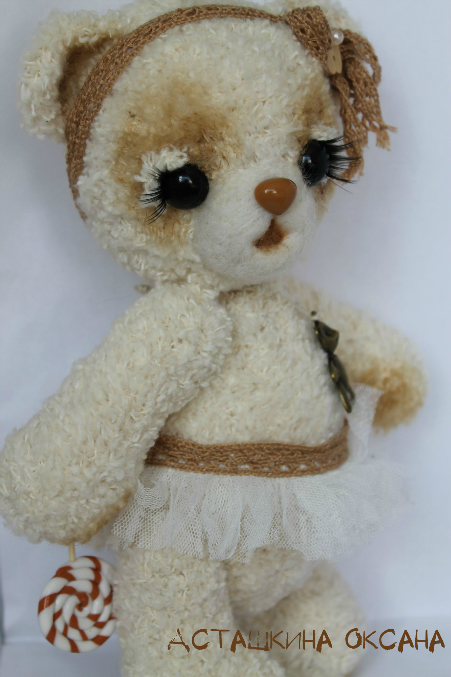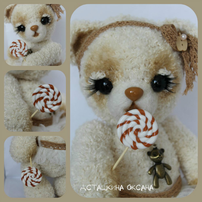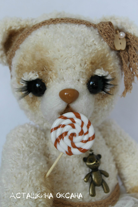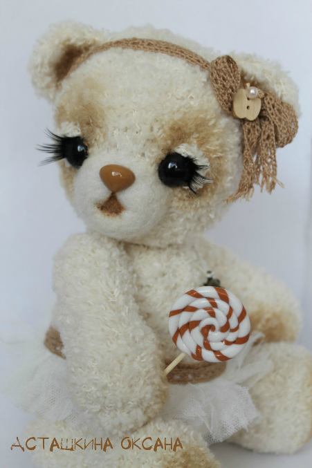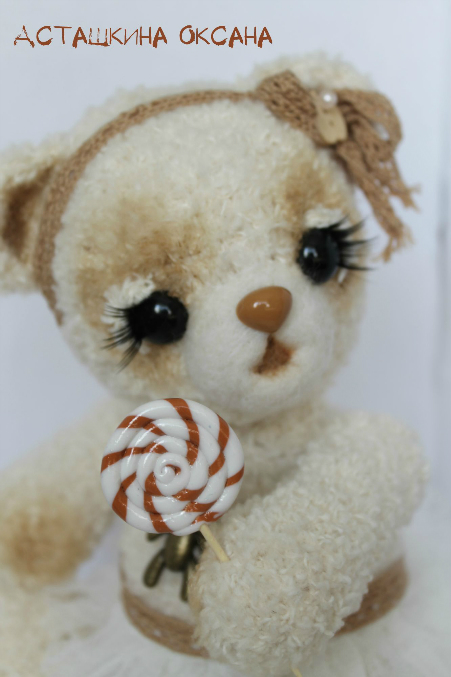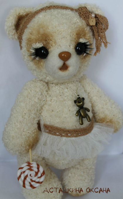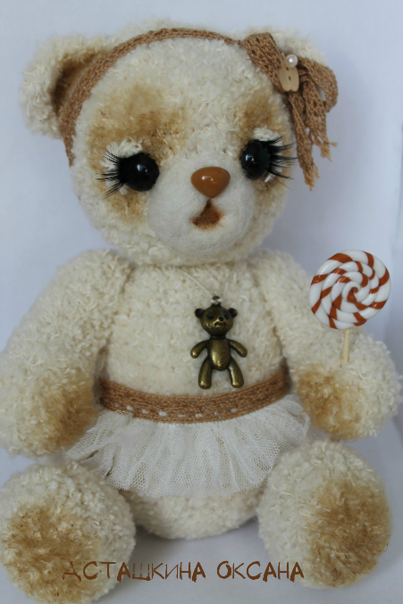Игрушечный мир - животныеМишка Сластенка связана из фактурной пряжи производства США, ростом 27см, тонирована кофе с ванилью, 6 шплинтов, в попке стеклянный гранулят, мордочка - сухое валяние, аксессуары: кружево, деревянная пуговица Яблочко, подвеска мишка, леденец из пластики.
