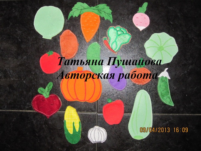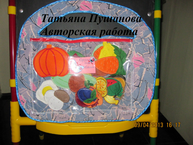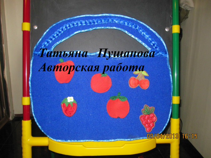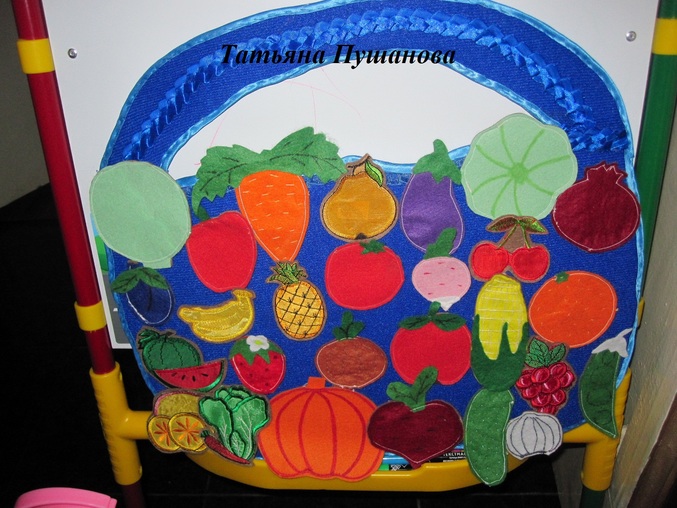У меня то ли корзинка, то ли сумочка вышла....незнаю...я отношусь к ней критично! Но доченьке нравится, у неё своё видение красоты! ) Основа корзинки - фетр с клейкой стороной, специально для липучек. Конечно, далеко не все плоды идеальны и ровные строчки (в идеале было, если бы все овощи и фрукты были апликациями, но, к сожалению не нашла). Вариантов игры с ней - масса!!!!!!!!!!!!!!! Осваиваем по-тихоньку!)))