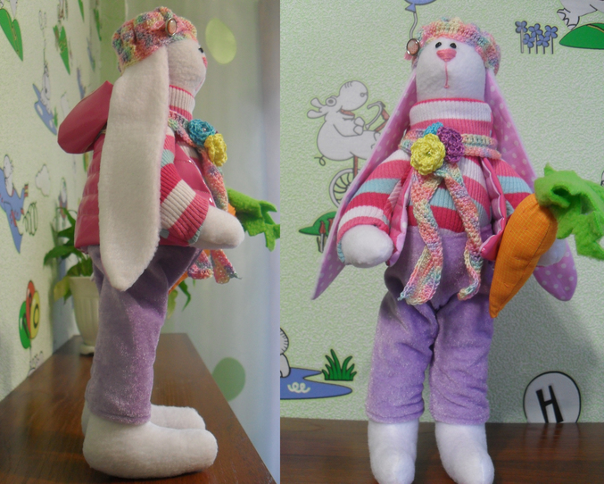 Юля,этого зайчика забирают.Вы в личку напишите какого хотите(в каких цветах,что в ручку ему вложить,вообщем ваши пожелания.Я сошью,выложу,если вам понравится,тогда деньги переведёте,адрес напишите и я отправлю)