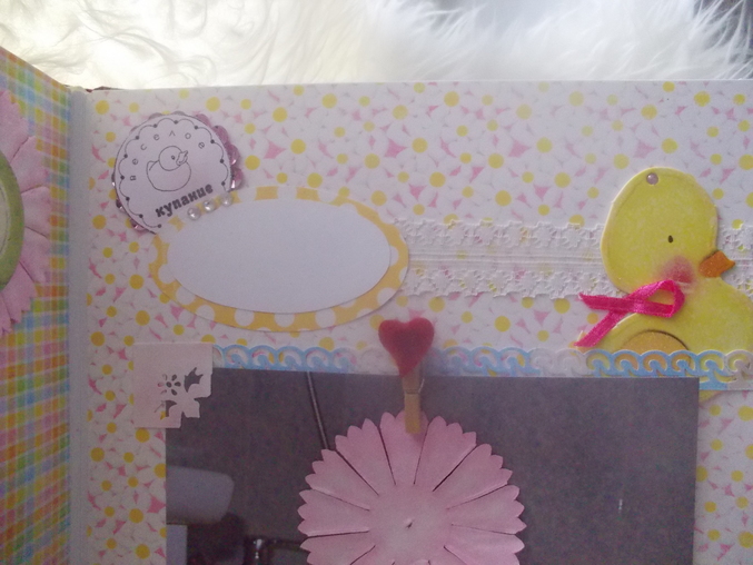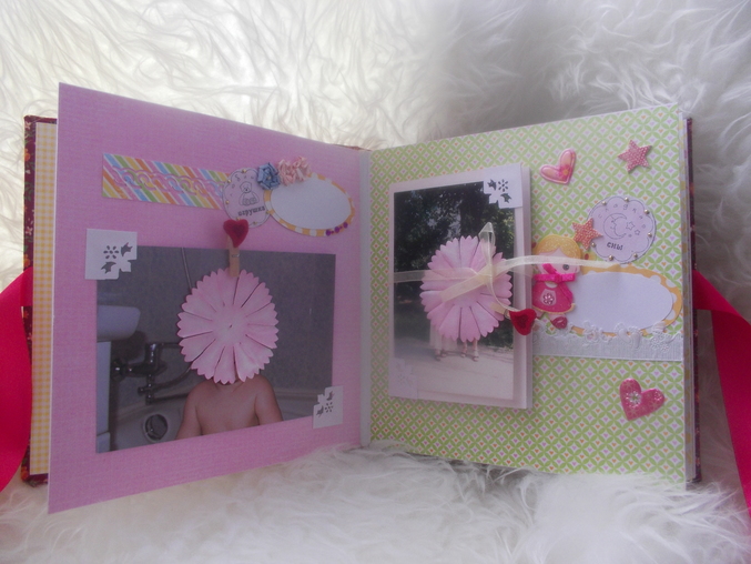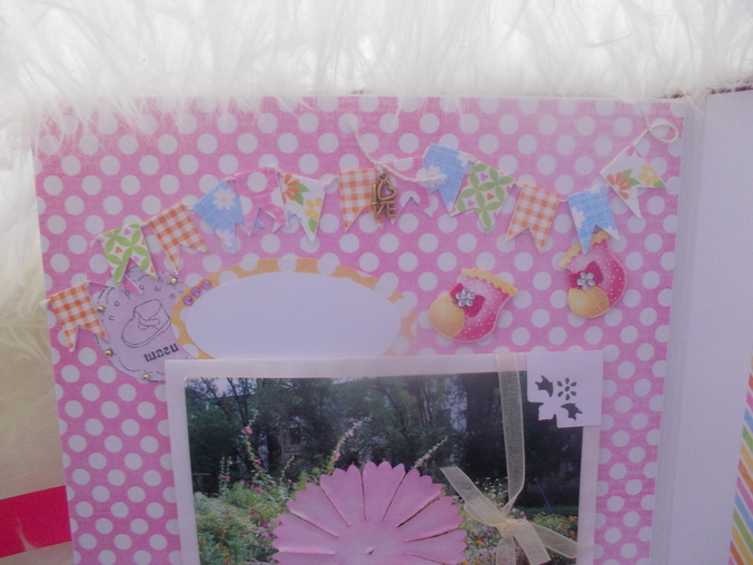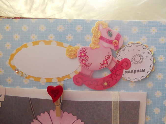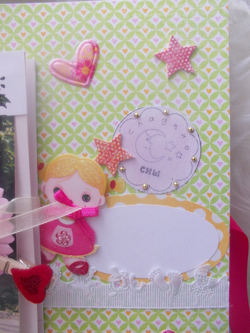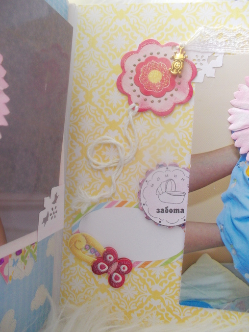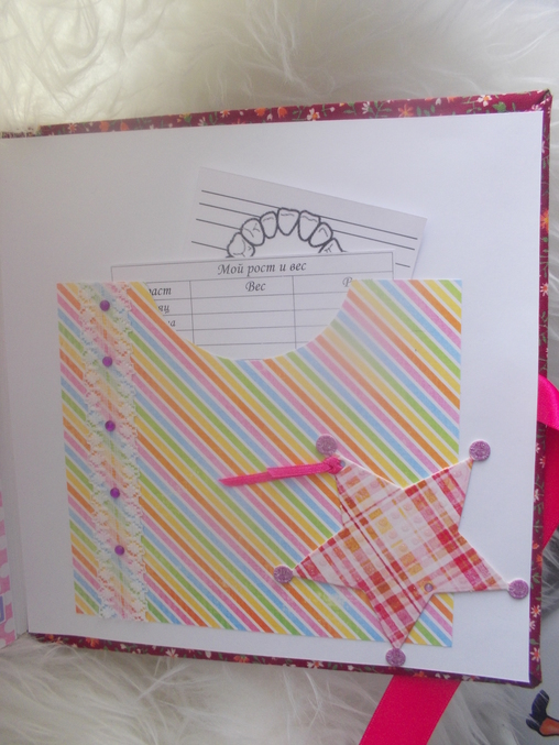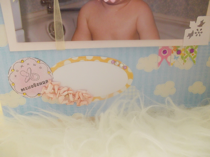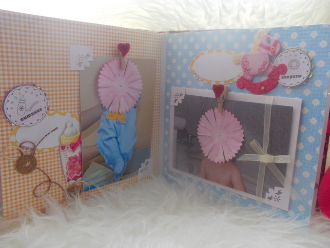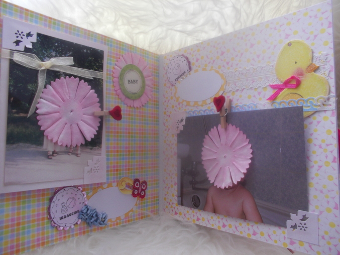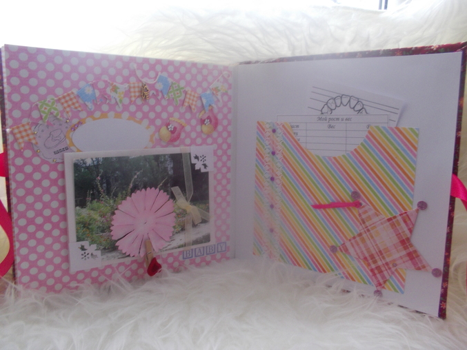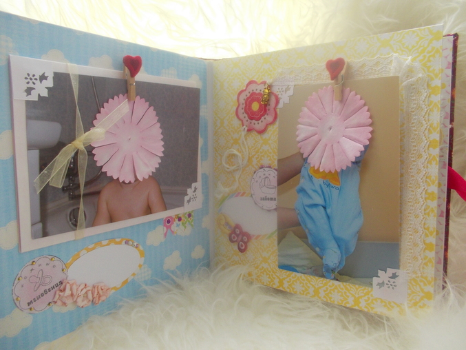 СкрапбукингАльбом делала на заказ. Для маленькой девочки Маруси. Размер альбома получился 20*20. Тканевая обложка. 6 разворотов. Вмещает 14 фото 10*15 и 15 фото 9*13. Есть теги для записи о весе, росте, зубках малышки и ее достижениях. И на каждой страничке, есть место куда можно написать дату или событие. Фотографий малышки не было, поэтому для удобства размещения декоративных элементов, вставляла фото своего сынишки.