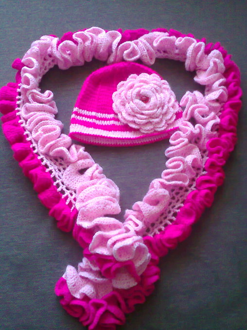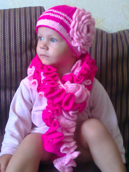 Первый комплект я решила назвать "Ассоль" из-за цветового подбора. Шарф уж очень напоминает Алые паруса. Нитки использовала YarnArt baby color - 3 моточка по 50г/100м и Пехорка "детская новинка" -2 моточка по50г/200м, шапочка вязана крючком №2,5, шарфик - №3,5. Очень уж шарфик много кушает.
