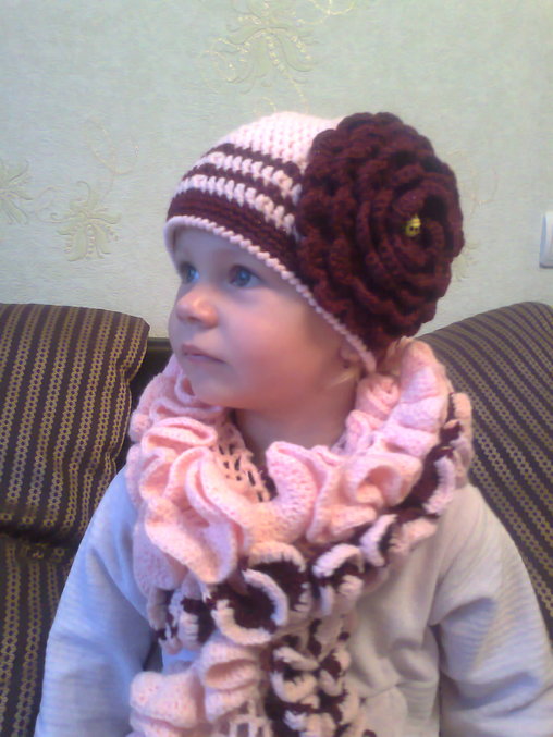 Второй комплект связан для хорошенькой девочки Заринки, оттуда и название "Заринка". В этом варианте шапочка и роза связаны в две нити на более прохладную погоду. Пряжу использовала BABY 100% акрил(100г/400м) - 2 мотка и MAGIC Romance 96% акрил 4% люрекс (100г/400м) 1 моток, крючок №2,7. Очень понравилось мне добавлять MAGIC Romance в отделку, за счёт люрекса (хоть и малого кол-ва) пряжа переливается на солнце. Очень красиво смотрится!!!