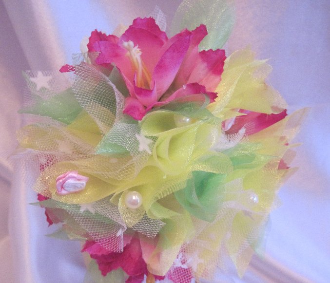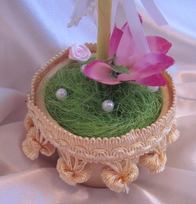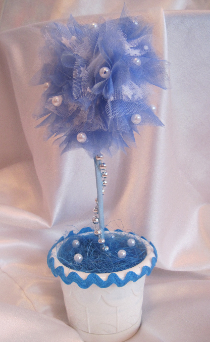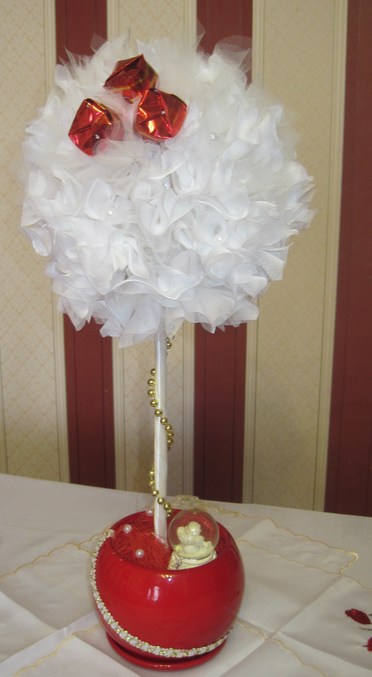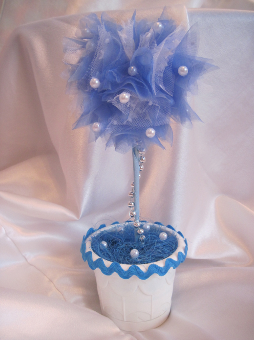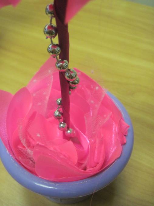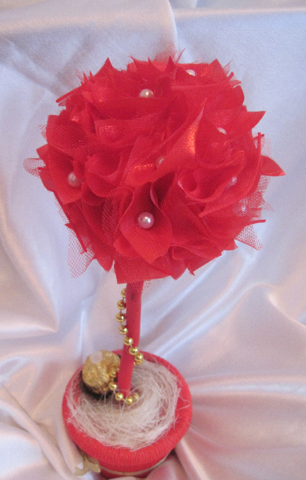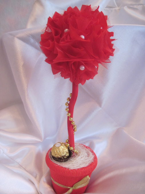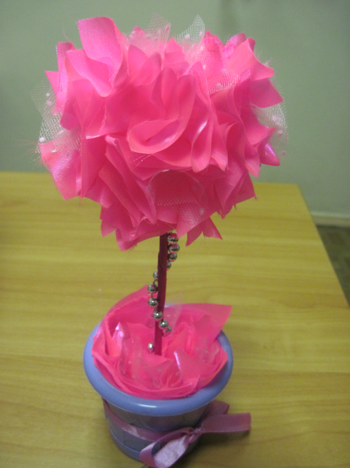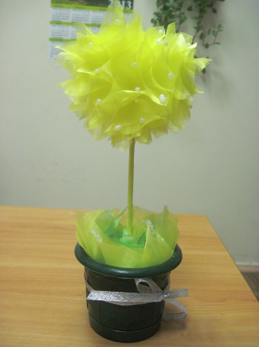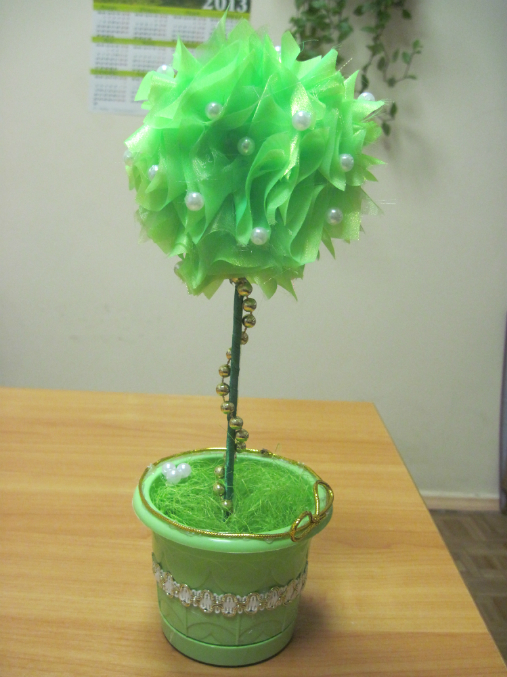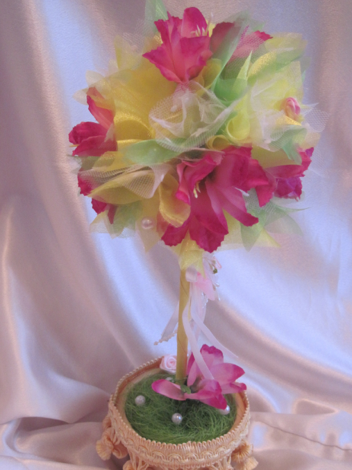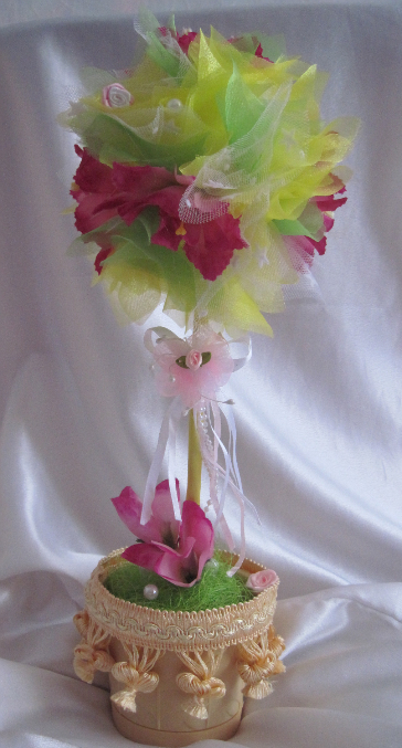 Спасибо Вам!) Я беру бумагу А4 и комкаю ее шар, затем скотчем скрепляю его. Скотча ровно столько, чтобы не разошелся шар - не надо десять раз обматывать шарик - как получится - все равно Вы будете клеить к нему органзу, цветы или другое украшение. Они все в какой-то мере и при дадут округлость. Шилом делаю отверстие для ствола и его же немного расширяю ножницами. Приклеиваю к стержню клеевым пистолетом. Стебель у меня из палочек для шашлыка (всегда беру 3 штуки) и обматываю их атласной ленточкой. Концы ленточек клею также на клеевой пистолет. Я заметила одну вещь - если взять горшок глянцевый ( блестящий), то после заливания в него строительного гипса (алебастра) при высыхании горшок начинает трескаться! Я теперь беру горшки без глянца - они тоже есть очень красивые!