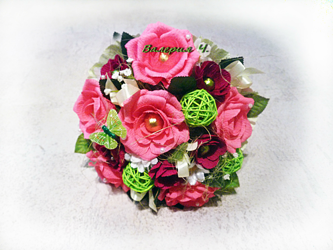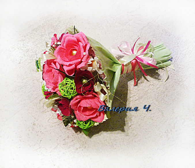 Ручной очень гармоничный, зацепило сочетание красных роз с зеленым декором!