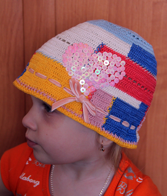 Вообще,задумывалась как шапочка, но в порыве извести все остаточки и сфантазировать рисунок так увлеклась процессом,что размахнулась...Пришлось регулировать лентой...Вот так и создаются "шедевры"
