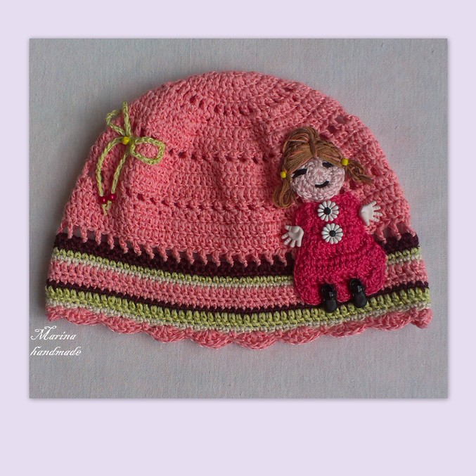 Здравствуйте!!! А я опять иду по следам знаменитой Vendula Maderska!!! Вот очередная моя шапочка с девочкой. Ниточки Саммер от Ярн Арт, крючок № 2,5.