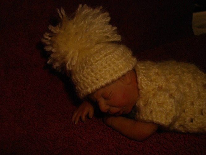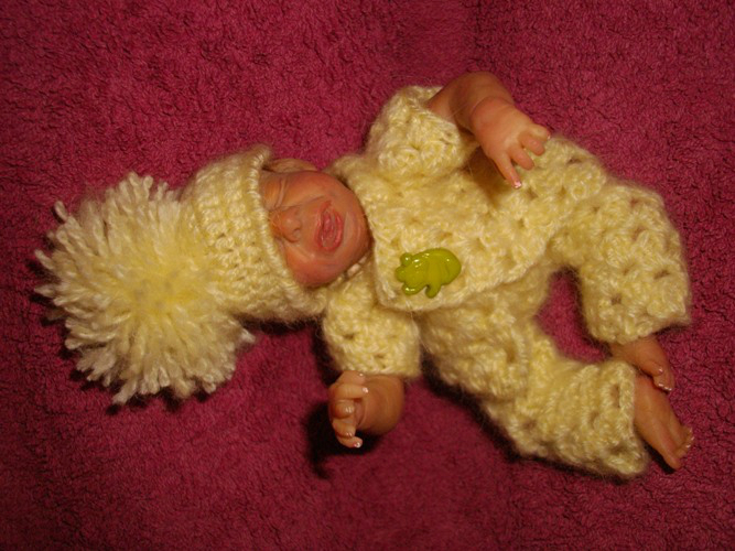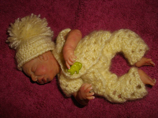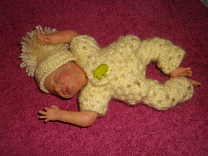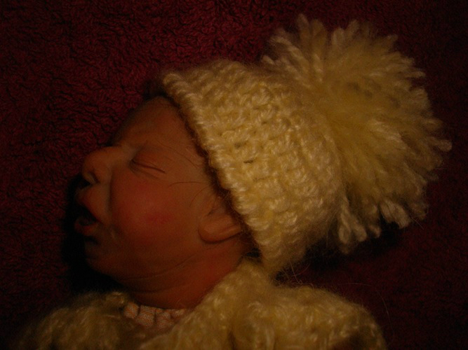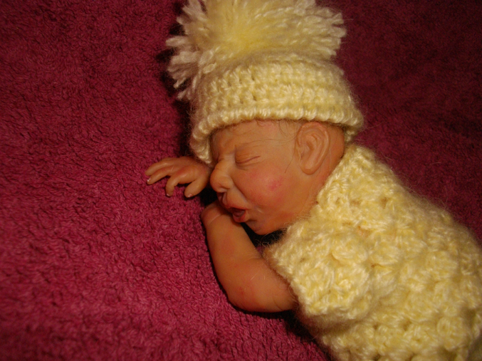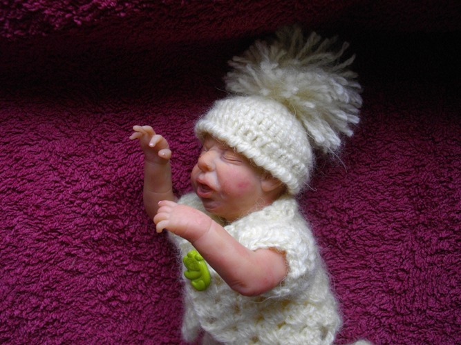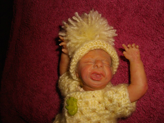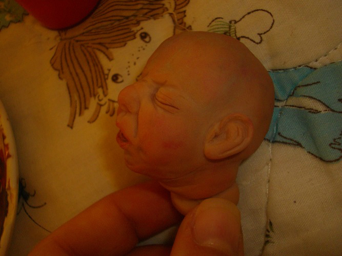 Так было и с этим малышом: был задуман плаксой и ревой, и таким я его и лепила, но когда он родился, я повернула его немного в профиль и обомлела - деть успокоился!!!! Он больше не плакал, только сосредоточенное личико было (как бывает у новорожденных, когда они кряхтят). Мой муж вообще обалдел. Сказал:"Это у него double face???" Нет, это один и тот же малыш!
