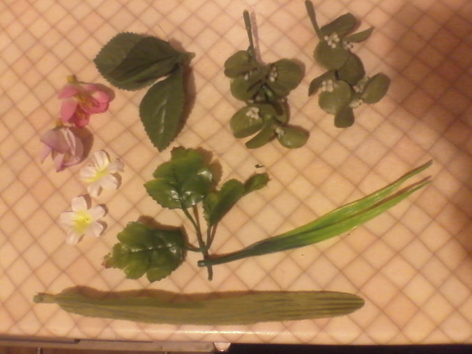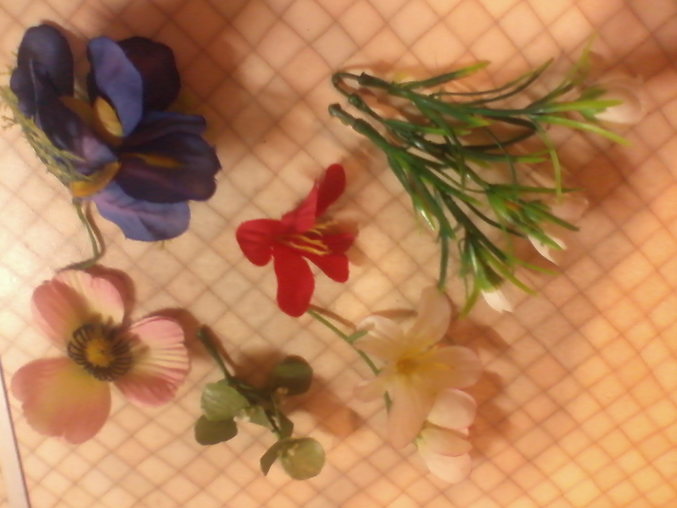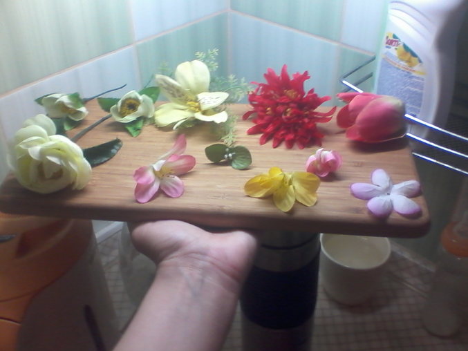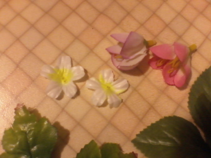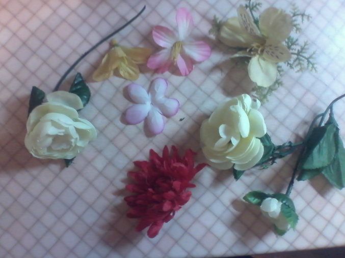 Искусственные цветы. Не удивляетесь, что на разделочной доске, просто фоткала под лампой дневного света, так как фотик накрылся, пришлось с телефоном возиться. Цветы и листья есть разные и много. Заинтересуетесь - нафоткаю ещё.
