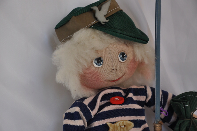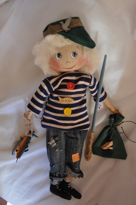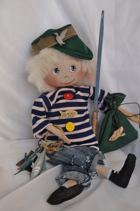 Рост 43 см. Текстильная кукла ручной работы "Удачливый Рыбачок". Жизнерадостный, удачливый, любит шутить, ловить рыбу в дружеской компании.