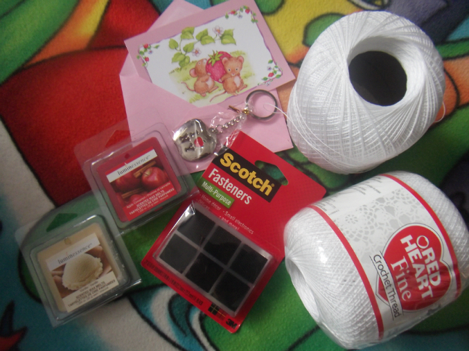 Ниточки белоснежные, очень тоненькие, думаю из них салфеточки новые связать ))) ароматные штучки (не знаю как их правильно назвать), липучки - очень нужная штука ))), брелочек - уже приладила к своему ключу, а то он, стыдно признаться, у меня последнее время на резинке обычной болтался ;) Открыточка, такая милая, а внутри небольшое письмецо от Элечки )))